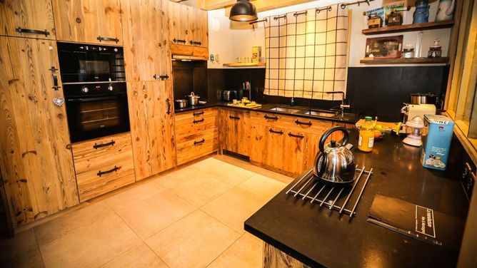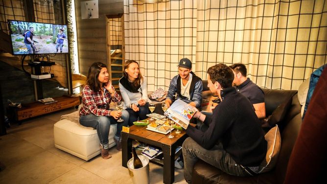 Tot de faciliteiten van het stenen en houten chalet behoren Wi-Fi en een skiruimte met skischoendroger.