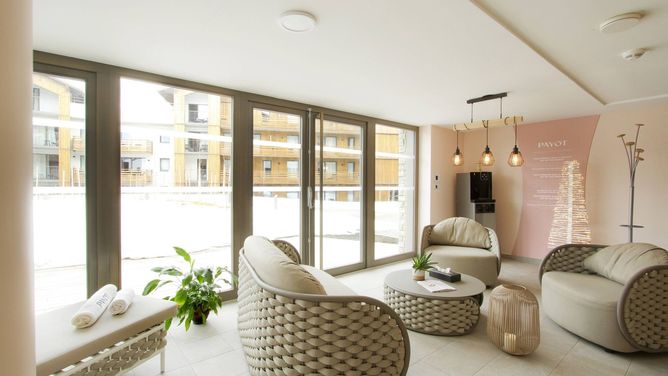 De ingang van het skigebied ligt op ca. 100 m afstand. De dichtstbijzijnde winkels liggen op ongeveer 600 m van de accommodatie.InrichtingDe algemene faciliteiten van de accommodatie bestaan uit een receptie, Wi-Fi, bar, kinderspeelplaats en een parkeergarage (tegen betaling, max. 2 plekken per appartement, reserveren voor aankomst vereist).