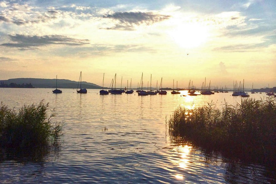 Camping direct aan de Bodensee gelegen, grote camping met veel vaste plaatsen, weinig schaduw.