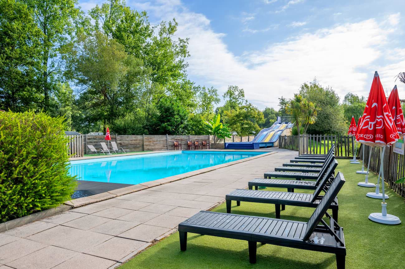 Zwembad met kinderbad en een mooie vijver. Er is een waterglijbaan met een lengte van 22m met drie pistes.