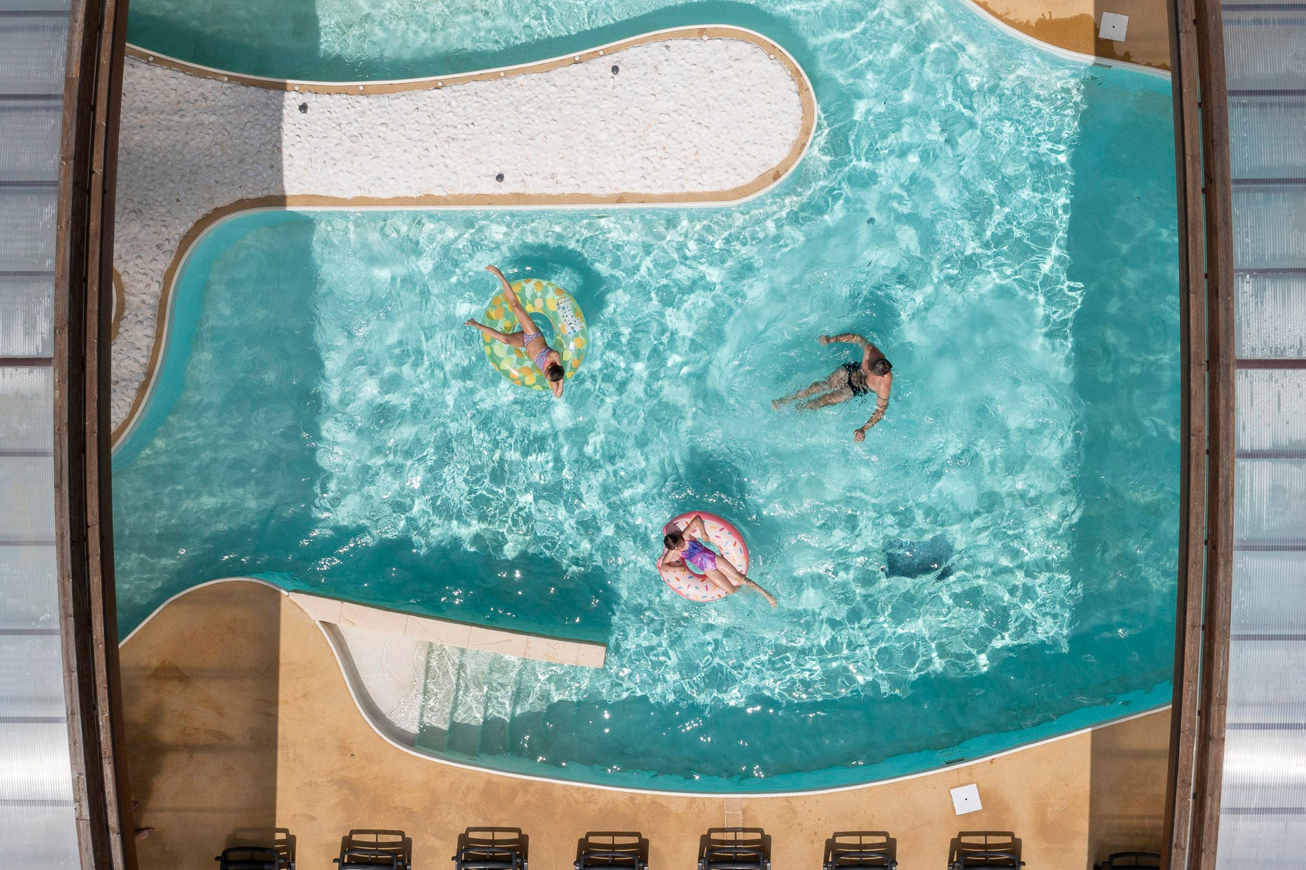 Openlucht- en overdekt zwembad met peutergedeelte. Modern en goed onderhouden sanitair, verdeeld over drie gebouwen.