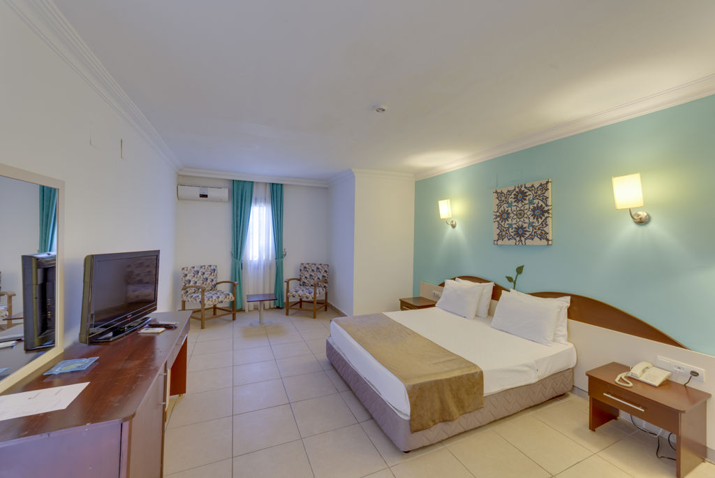 35 m² * Bestaat uit 2 ruimtes met extra bedden of een stapelbed * Dezelfde faciliteiten als de standaardkamer Sport & Ontspanning * Aerobics * Tafeltennis * Fitness * Watersporten aan het strand* * Turks bad* * Sauna* * Massages en schoonheidsbehandelingen* * 1 keer per week een Turkse avond * 1 keer per week een dansshow *Tegen betaling Kinderfaciliteiten * 1 kinderzwembad * Speeltuintje Zwembaden & Strand * 1 buitenzwembad * Zonneterras * Privéstrand * Ligbedden, matrasjes en parasols gratis (zwembad en strand) * Badhanddoekenservice met borg Verzorging Zomer: Yelken Mandalinci * Verblijf o.b.v. All Inclusive: * Ontbijt in buffetvorm (07.30-10.00 uur) * Laat ontbijt in buffetvorm (10.00-11.00 uur) * Lunch in buffetvorm (12.30-14.00 uur) * Diner in buffetvorm (19.00-21.00 uur) * Snacks (14.30-17.00 uur) * Koffie/thee en koekjes (17.00-18.00 uur) * Nachtsnack (23.00-00.00 uur) * Geselecteerde lokale alcoholische en alcoholvrije drankjes (10.00-23.00 uur) * Tegen betaling: Roomservice, Turkse koffie, verse vruchtensappen en alle drankjes na 23.00 uur.
