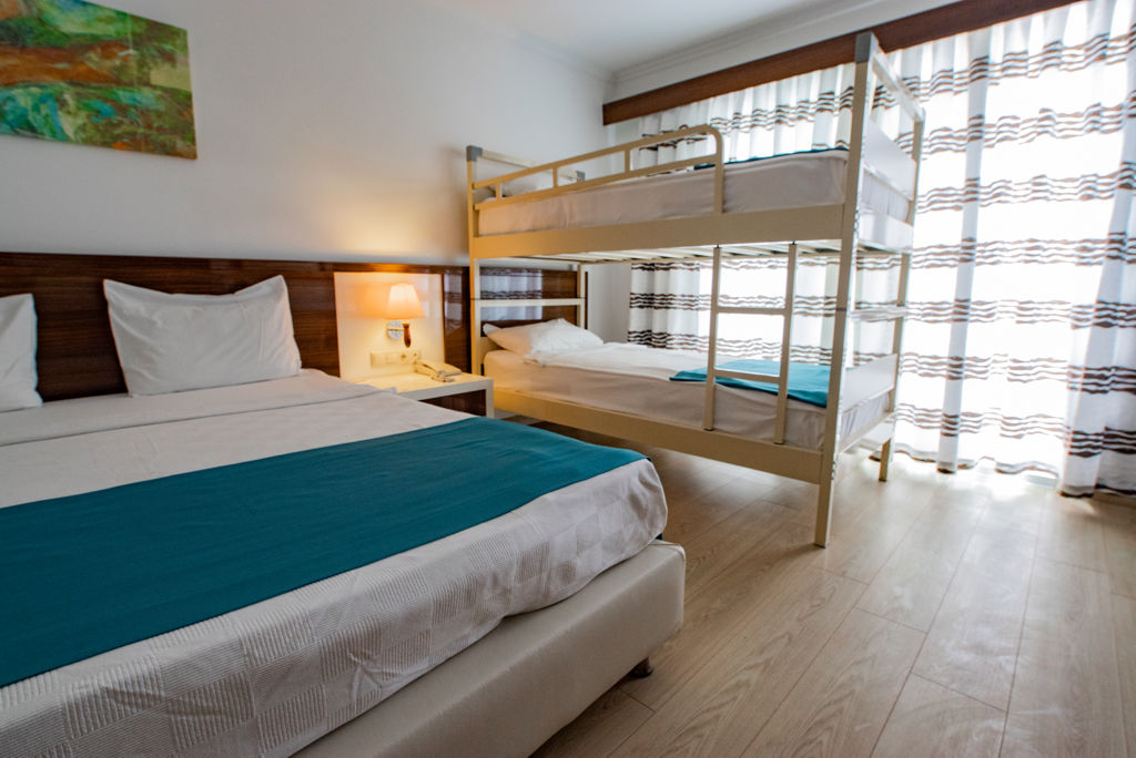 + 2 kind.) * Ca. 45-50 m² * Bestaat uit 1 ruimte met extra bedden * Dezelfde faciliteiten als de standaardkamer landzicht Activiteiten & ontspanning * Fitness * Aerobics * Yoga * Boccia * Darts * Beachvolleybal * Tafeltennis * Watersporten aan het strand* * Turks bad * Sauna * Binnenzwembad * Massages en behandelingen* * 6 dagen per week entertainment *Tegen betaling Kinderfaciliteiten * 1 kinderzwembad * 1 verwarmd binnen kinderzwembad * Kidsclub (4-12 jaar) * Minidisco * Speeltuintje * Babybedjes op aanvraag en tegen betaling * Babysitservice op aanvraag en tegen betaling Verzorging Zomer: Azure By Yelken * Verblijf o.b.v. Ultra All Inclusive: * Ontbijt in buffetvorm (07.00-10.00 uur) * Laat ontbijt in buffetvorm (10.00-10.30 uur) * Lunch in buffetvorm (12.30-14.00 uur) * Diner in buffetvorm (18.30-21.00 uur) * Snacks (12.00-17.30 uur) * IJs 24 uur per dag * Koffie/thee en koekjes (12.00-17.30 uur) * Nachtsnack (23.30-01.00 uur) * Bij een verblijf van minimaal 8 dagen kun je 1 maal dineren in een van de à-la-carterestaurants (vooraf reserveren) * Geselecteerde lokale alcoholische en alcoholvrije drankjes en een aantal import drankjes 24 uur per dag inbegrepen * Tegen betaling: importdrankjes, verse vruchtensappen, drinken in flessen, roomservice, flessen wijn en energiedrankjes en dineren in de à-la-carterestaurants buiten 1 x gratis per 8 dagen.