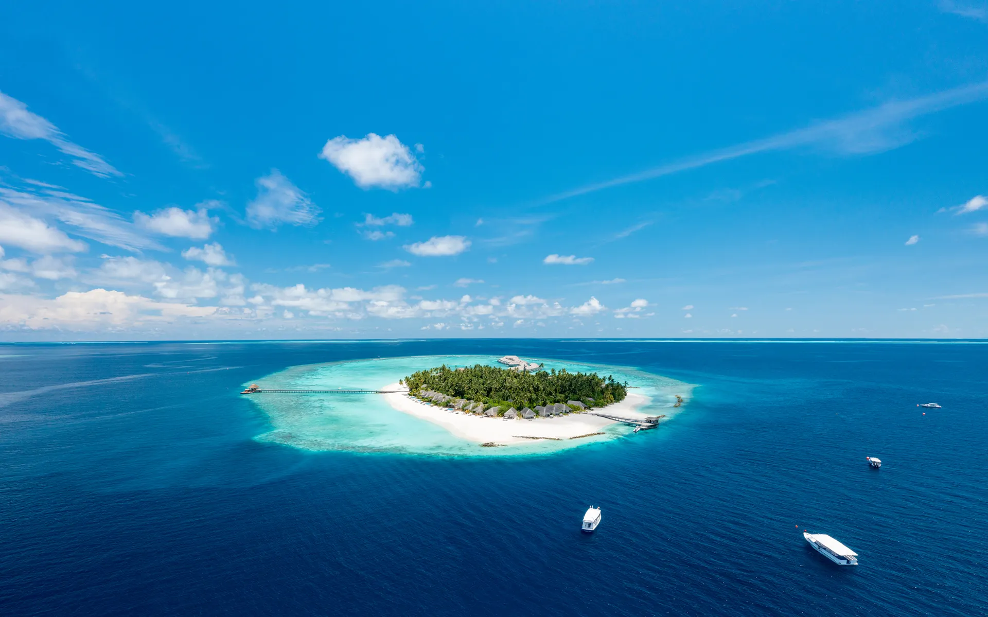 Het strandhotel heet de gasten in Dhaalu-atol welkom.