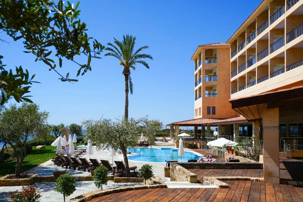 Het hotel bevindt zich op een schiereiland met uitzicht over Coral Bay en de Myceense opgravingen van Maa Palaiokastro.