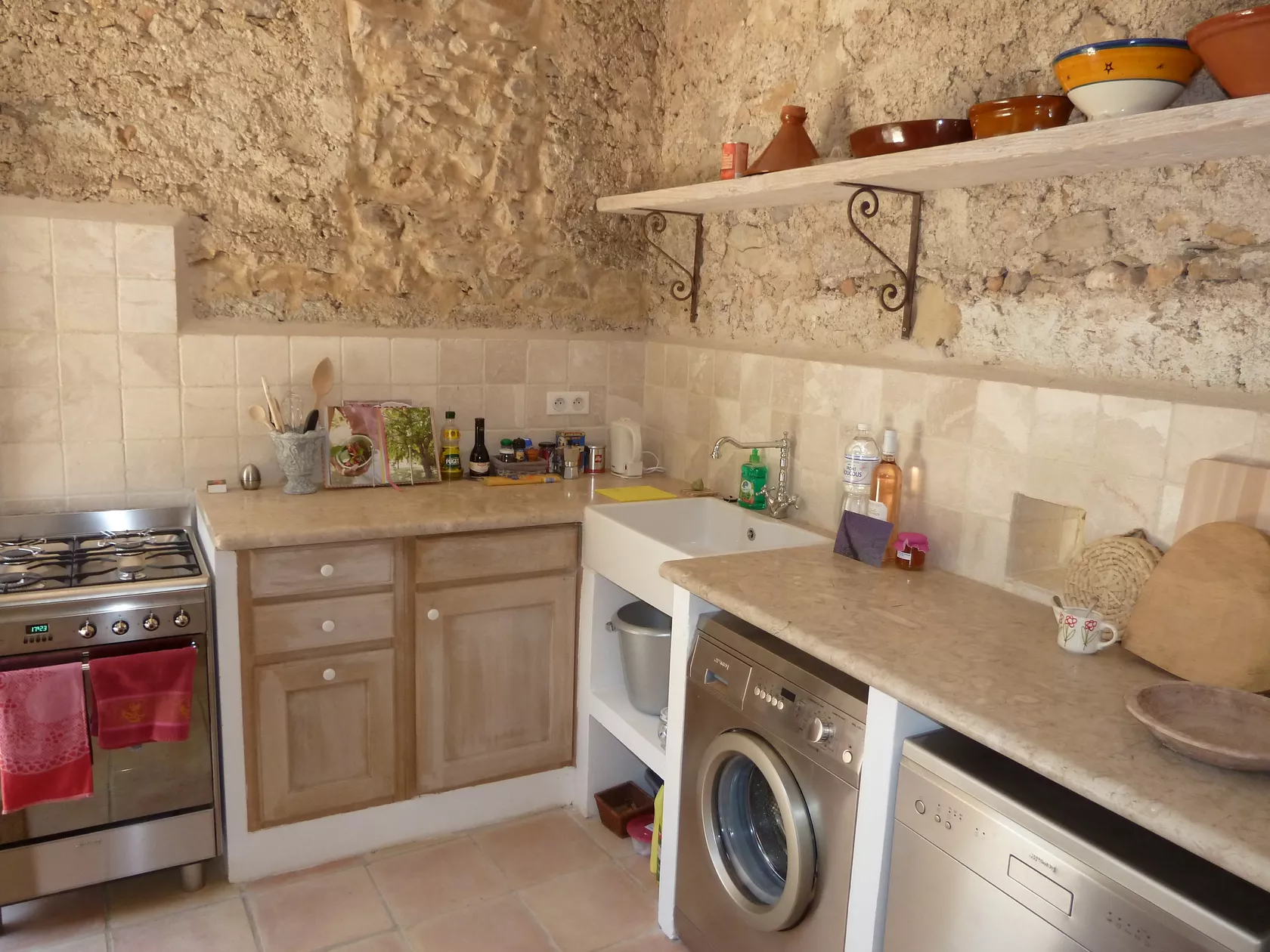 De keuken heeft een fornuis met oven, een wasmachine, een afwasmachine en een koelkast-vriezer.