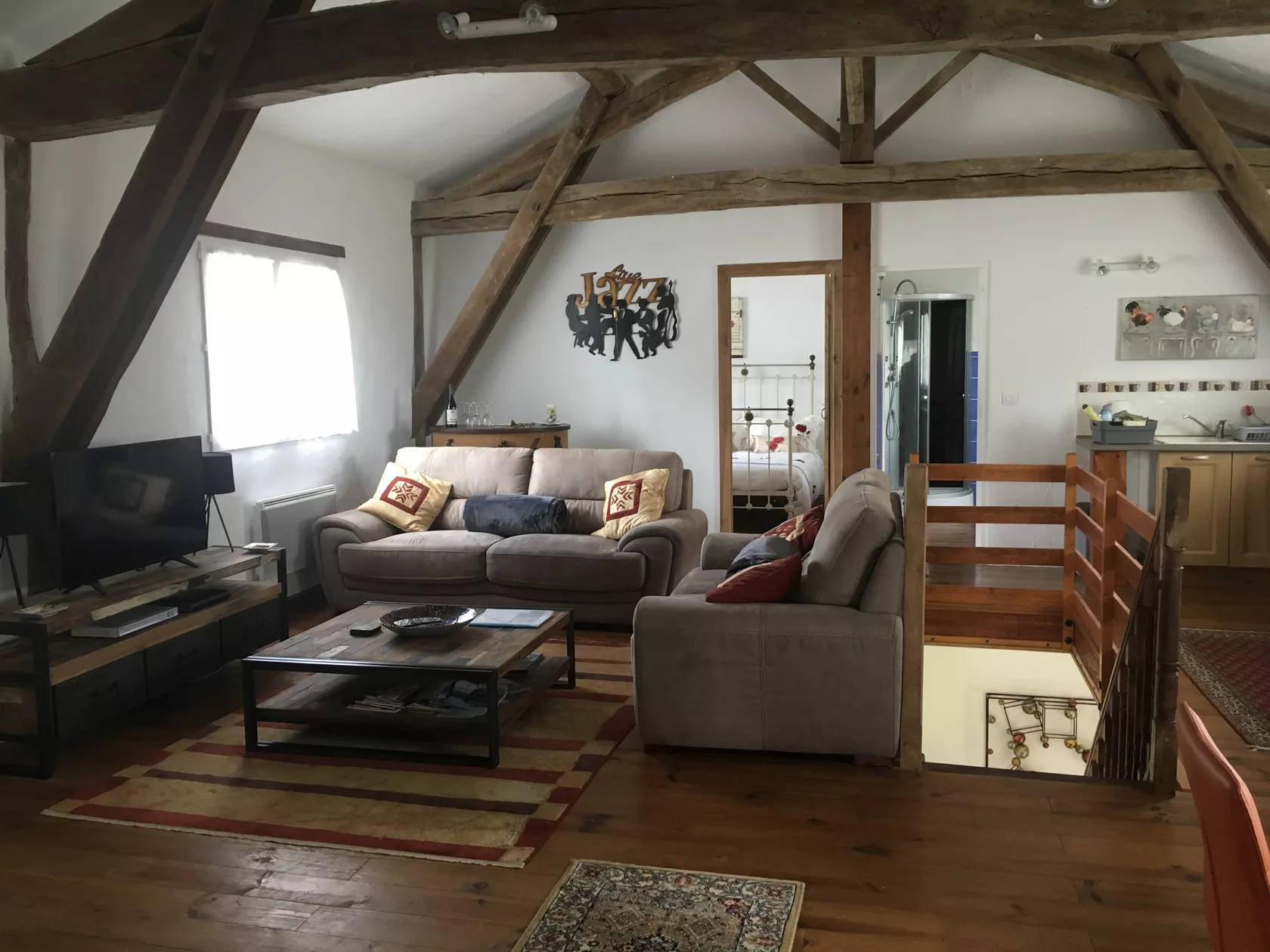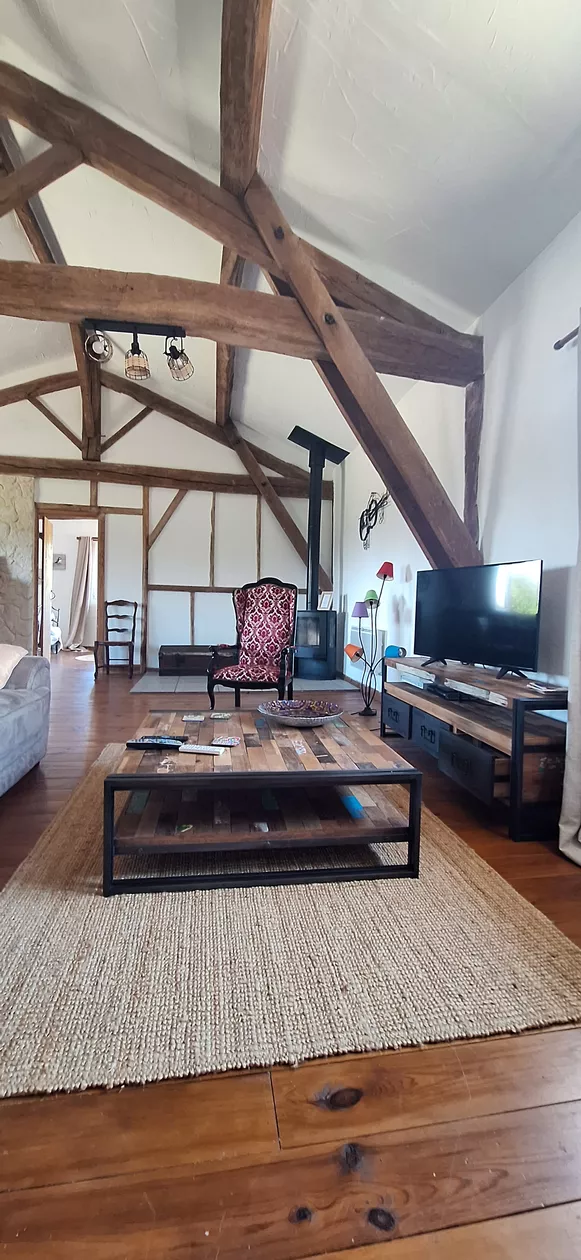Gite Les Pignons heeft een grote open woonkamer met keuken, zitkamer en eethoek.