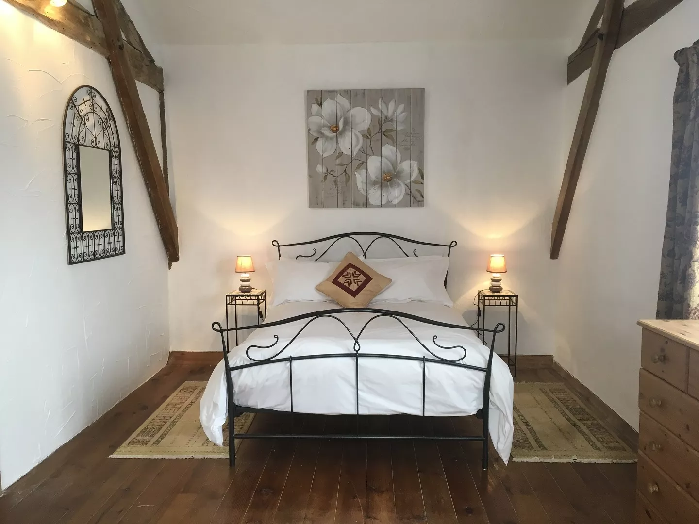 Een omgebouwde tabaksschuur met twee slaapkamers op de eerste verdieping, prachtig ingericht en compleet met houtkachel voor de koudere maanden, gelegen in een volledig omheinde tuin van 15 hectare.