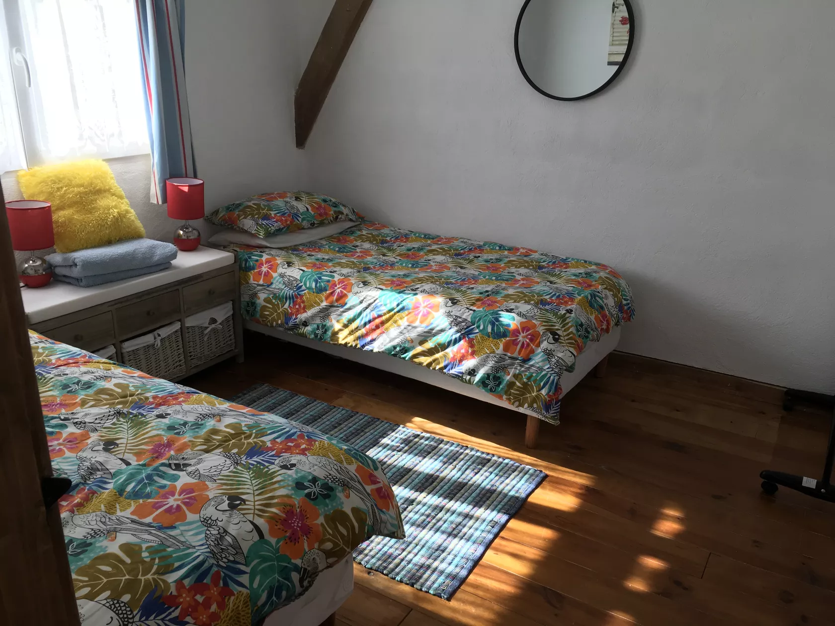 Een grote tweepersoonskamer met kledingkast, ladekast, tweepersoonsbed en een kamer met twee eenpersoonsbedden of een tweepersoonsbed, afhankelijk van wat je wilt. Reisbedje beschikbaar. Beide kamers hebben staande ventilatoren voor de warmere maanden. Alle kamers hebben elektrische wandradiatoren voor de koelere maanden.