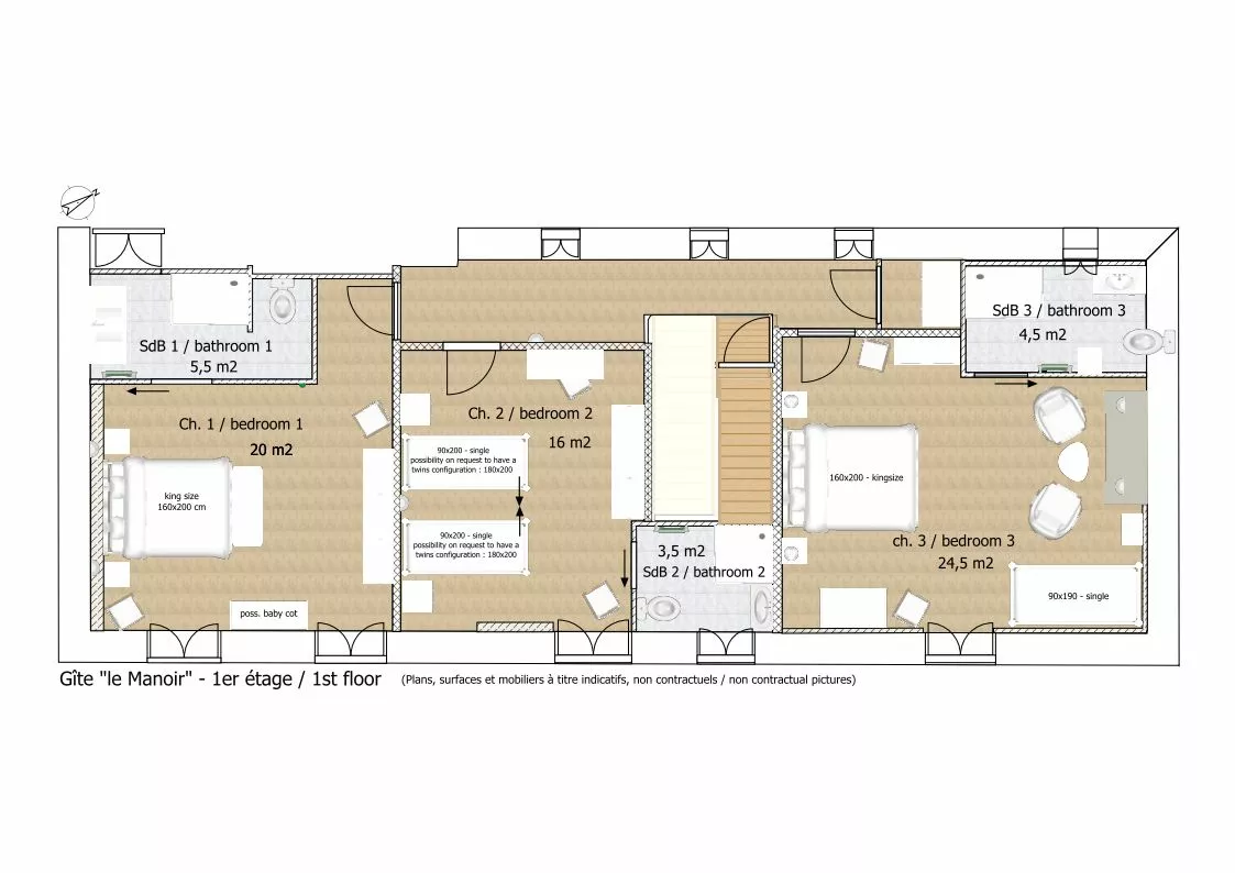 Kinderbedjes en uitrusting voor jonge kinderen zijn op aanvraag beschikbaar..