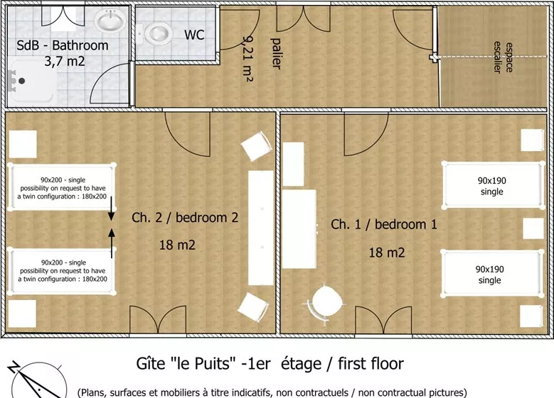 Er zijn twee tweepersoonskamers met 2 aparte bedden, een met eigen douche en er is nog een tweede doucheruimte.
