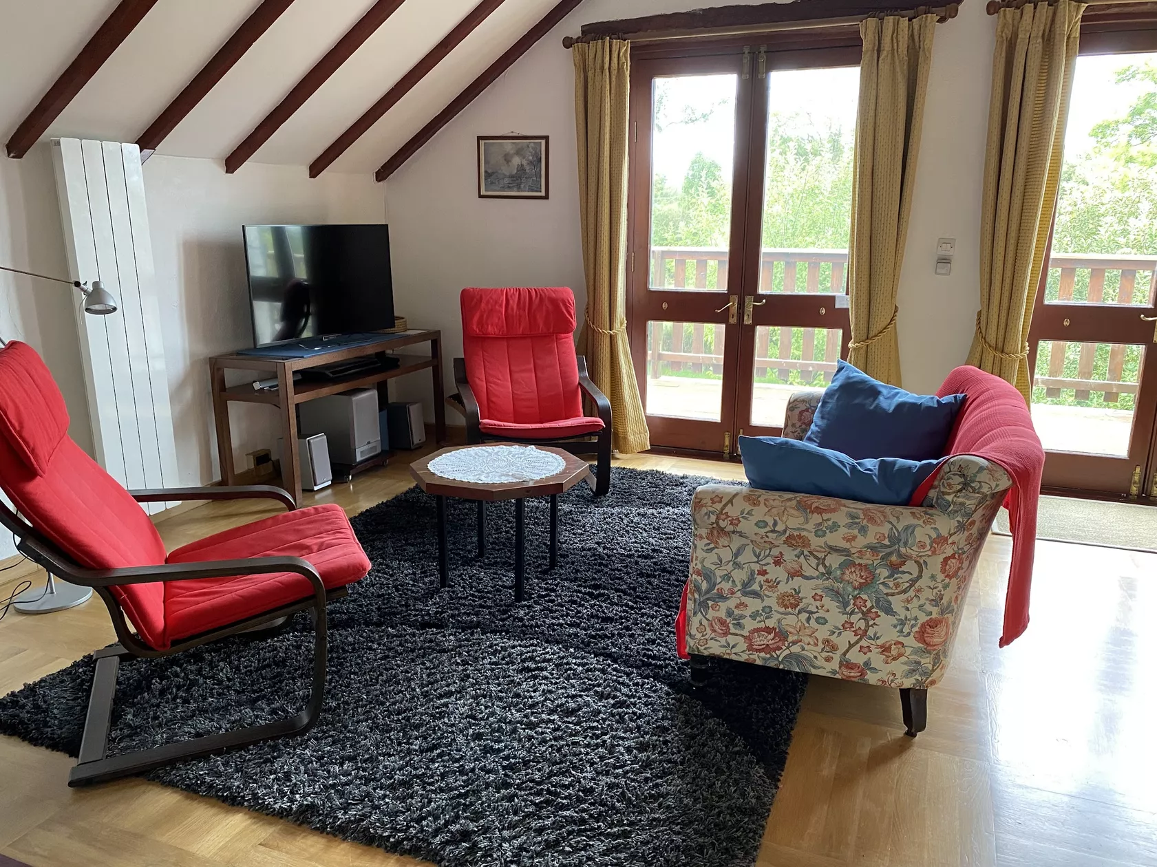 Op de eerste verdieping kan je dan weer gezellig vertoeven in de leefruimte, of nagenieten van je dag op het ruim terras met een glaasje wijn en een panoramisch zicht op de omringende weiden. Op dezelfde verdieping vind je 2 slaapkamers en een badkamer met douche, lavabo en WC.