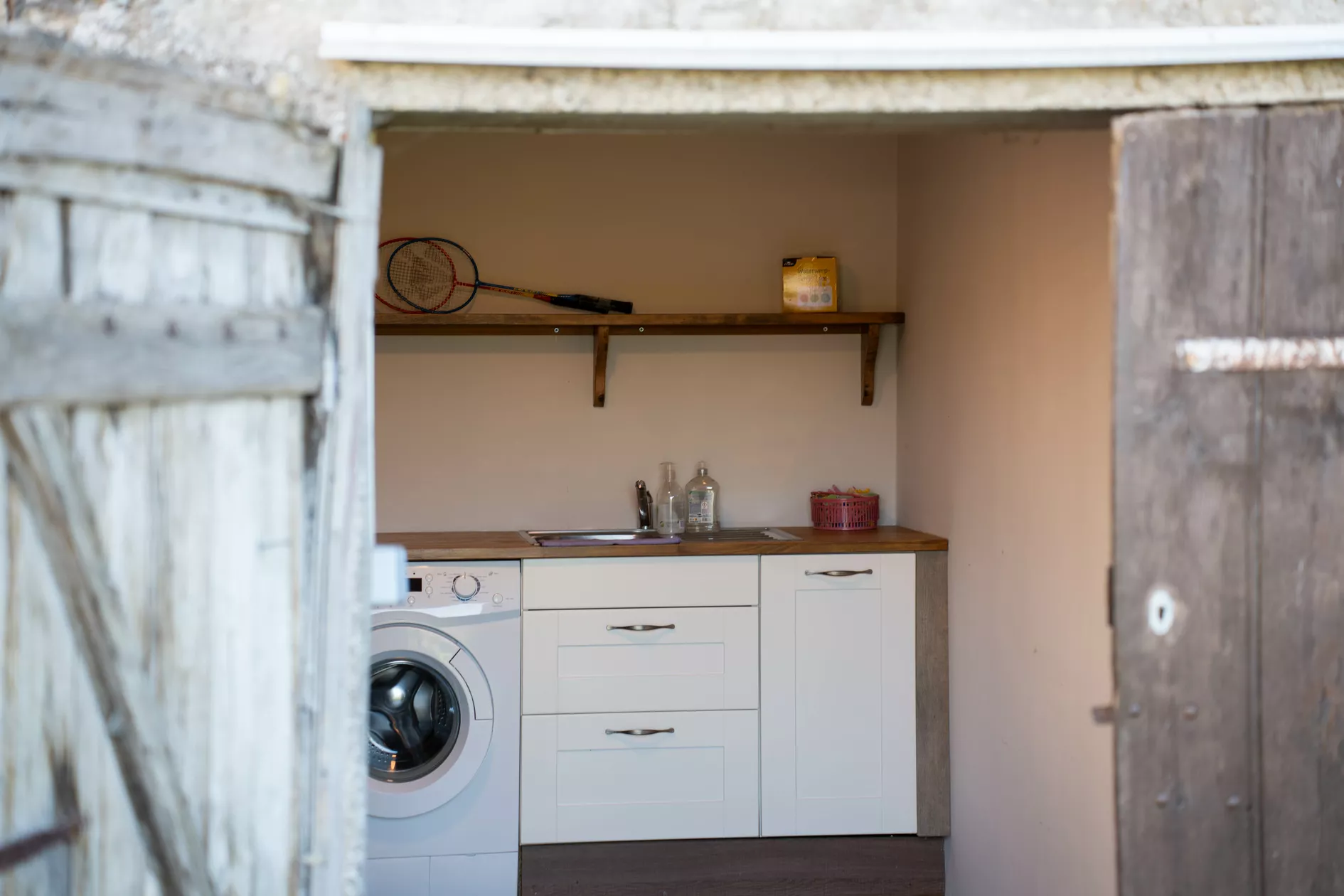 Wasmachine, fietsenstalling en houtvoorraad voor de kachel vindt u in de naast gelegen ruimte in de schuur..