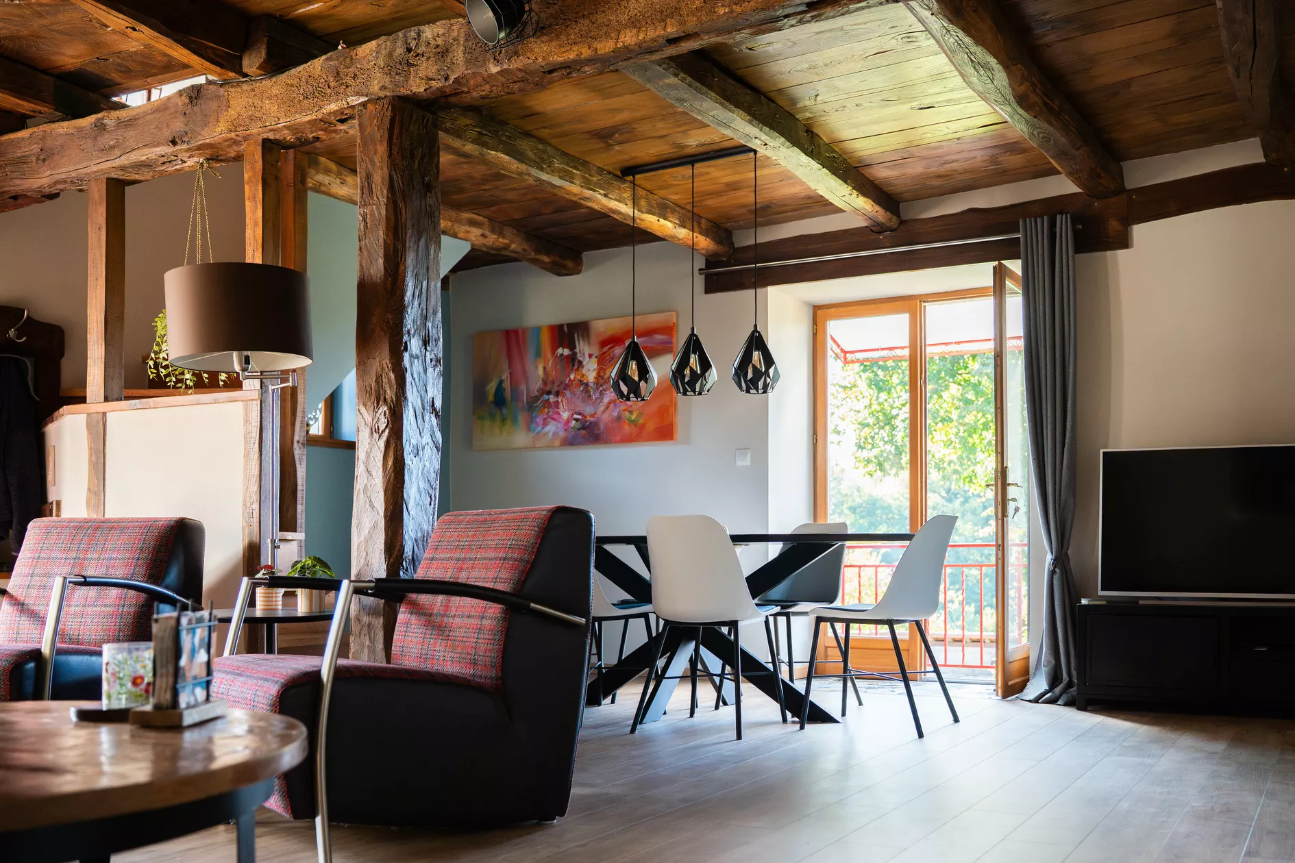 De vakantiewoning blijft mooi met de prachtige authentieke balken en een grote houtkachel.