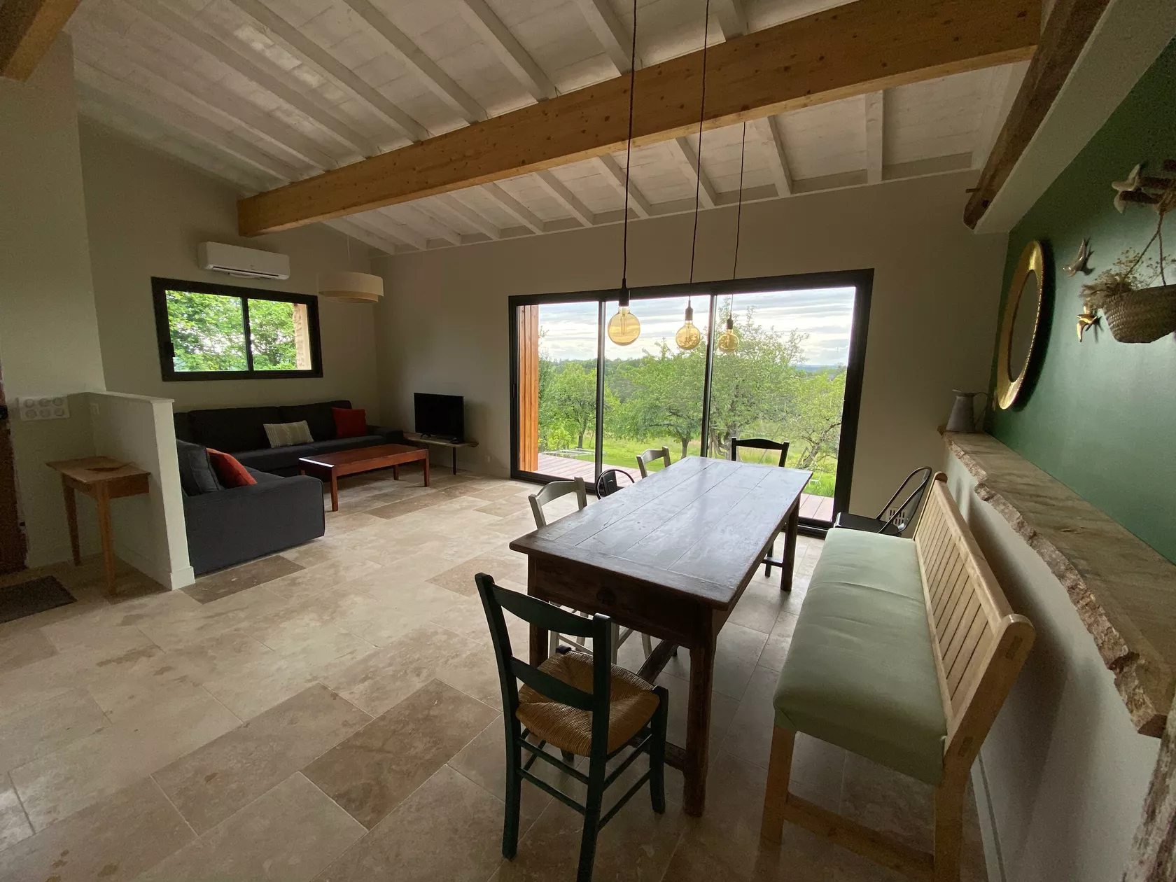 De gelijkvloerse woning, heeft een grote woonkamer met een open keuken en airconditioning. De woonkamer is een zeer lichte, open ruimte waar een grote schuifpui een prachtig uitzicht geeft over de boomgaard en de heuvels.