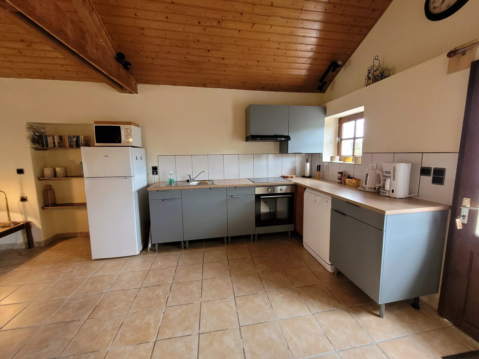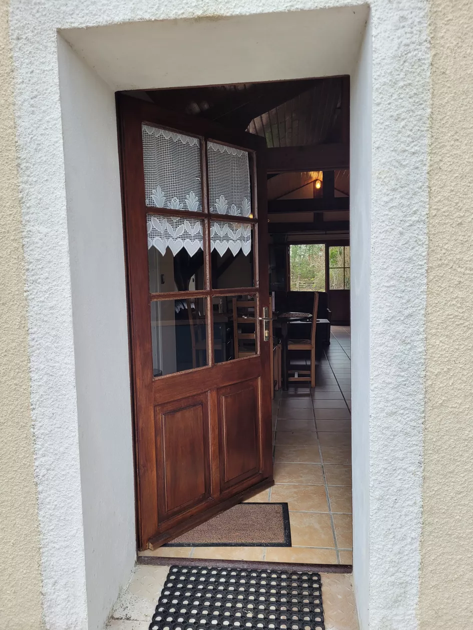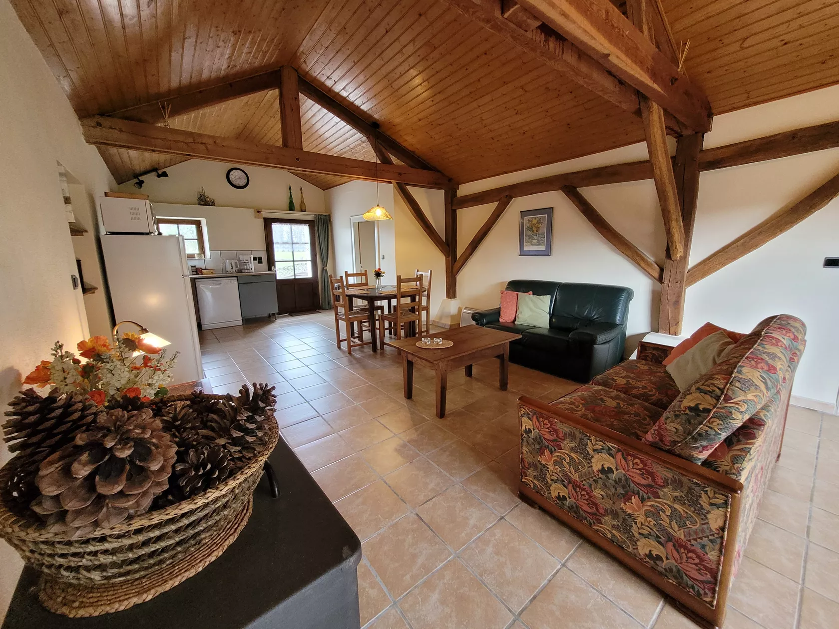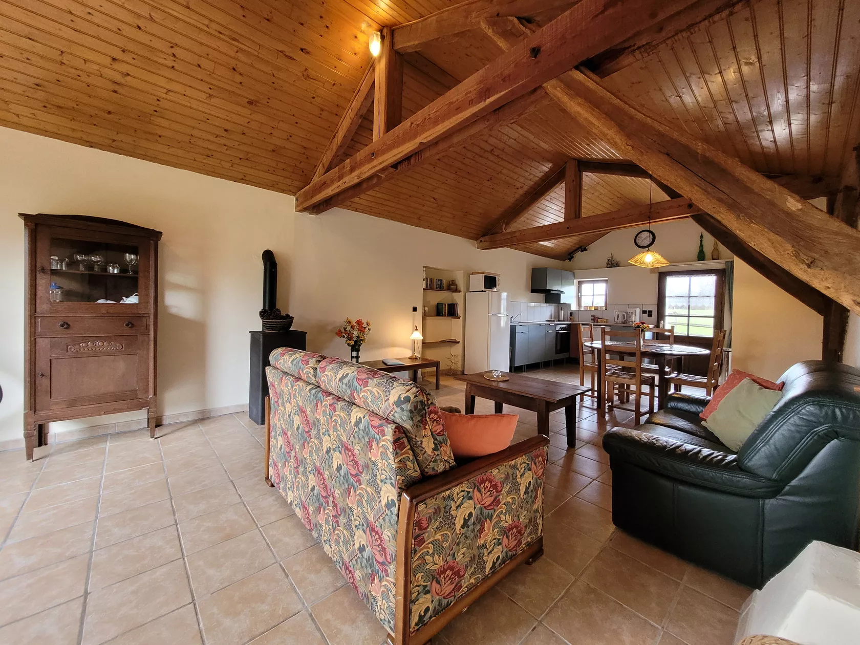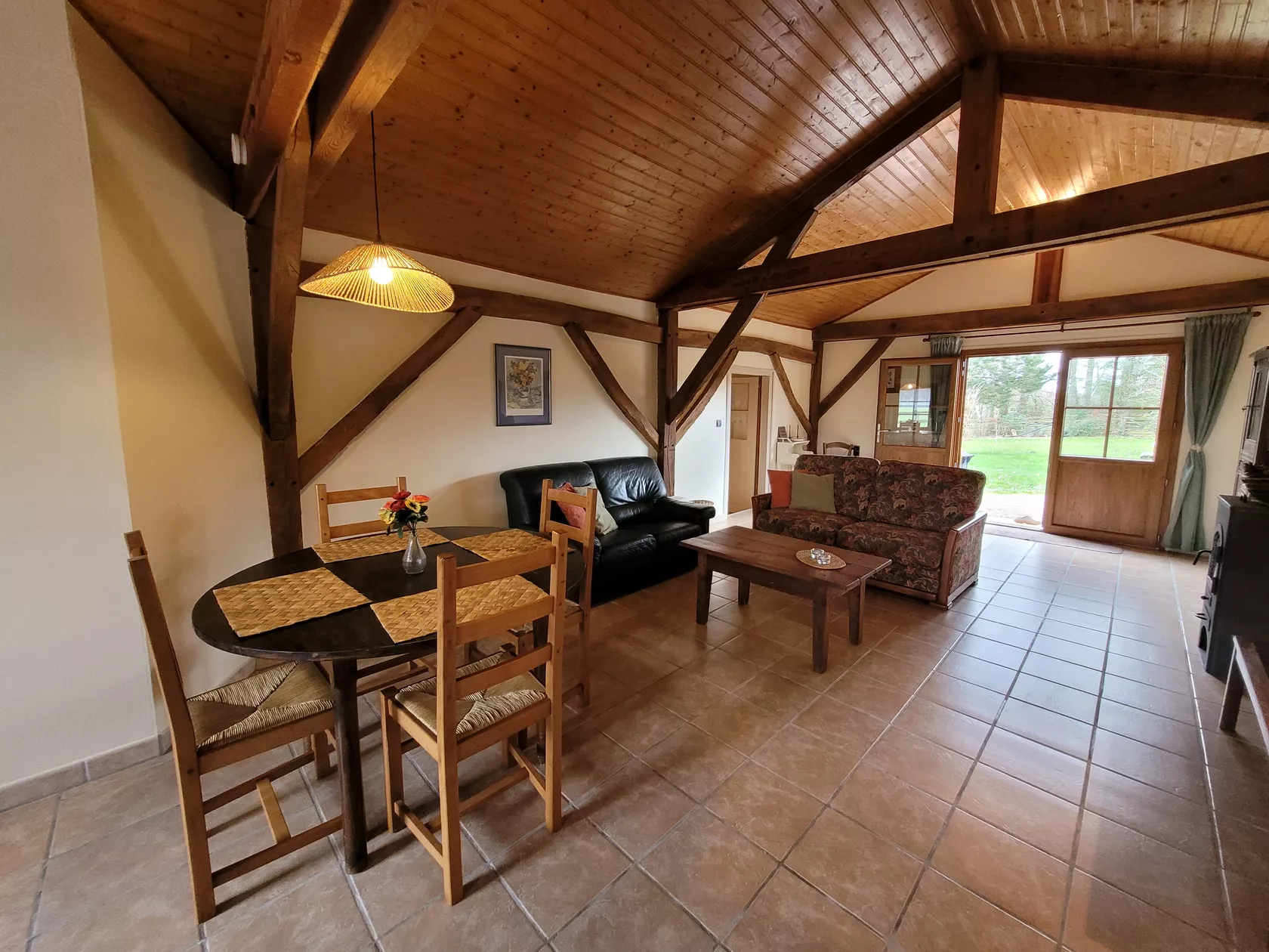 Via de openslaande tuindeuren kom je de gite binnen in de woonkamer voorzien van zithoek met bank en gerieflijke stoelen, een eethoek en een volledig ingerichte keuken.