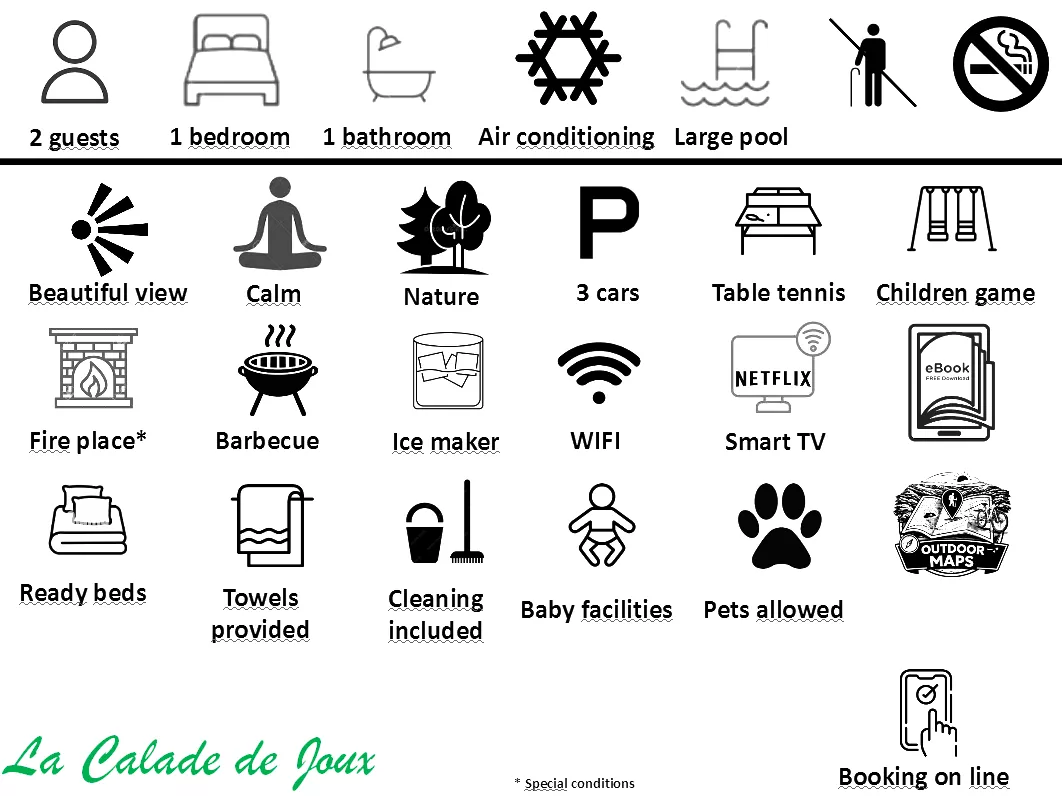 Er is een comfortabel salon met een grote sofa, een grote televisie en een NETFLIX account voor filmavonden. In het seizoen kun je ook genieten van een gezellige Cévenole open haard. De keuken is volledig uitgerust met alles wat je nodig hebt om je maaltijden te bereiden: oven, magnetron, koelkast, vriezer, vaatwasser en al het keukengerei dat je nodig hebt voor een aangenaam verblijf.