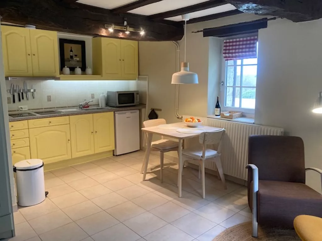 Er staan twee fauteuils met tafeltje en lamp en een eettafel met twee stoelen. De keuken is eenvoudig maar doelmatig ingericht en heel geschikt voor het bereiden van ontbijt, lunch en eenvoudige avondmaaltijden.