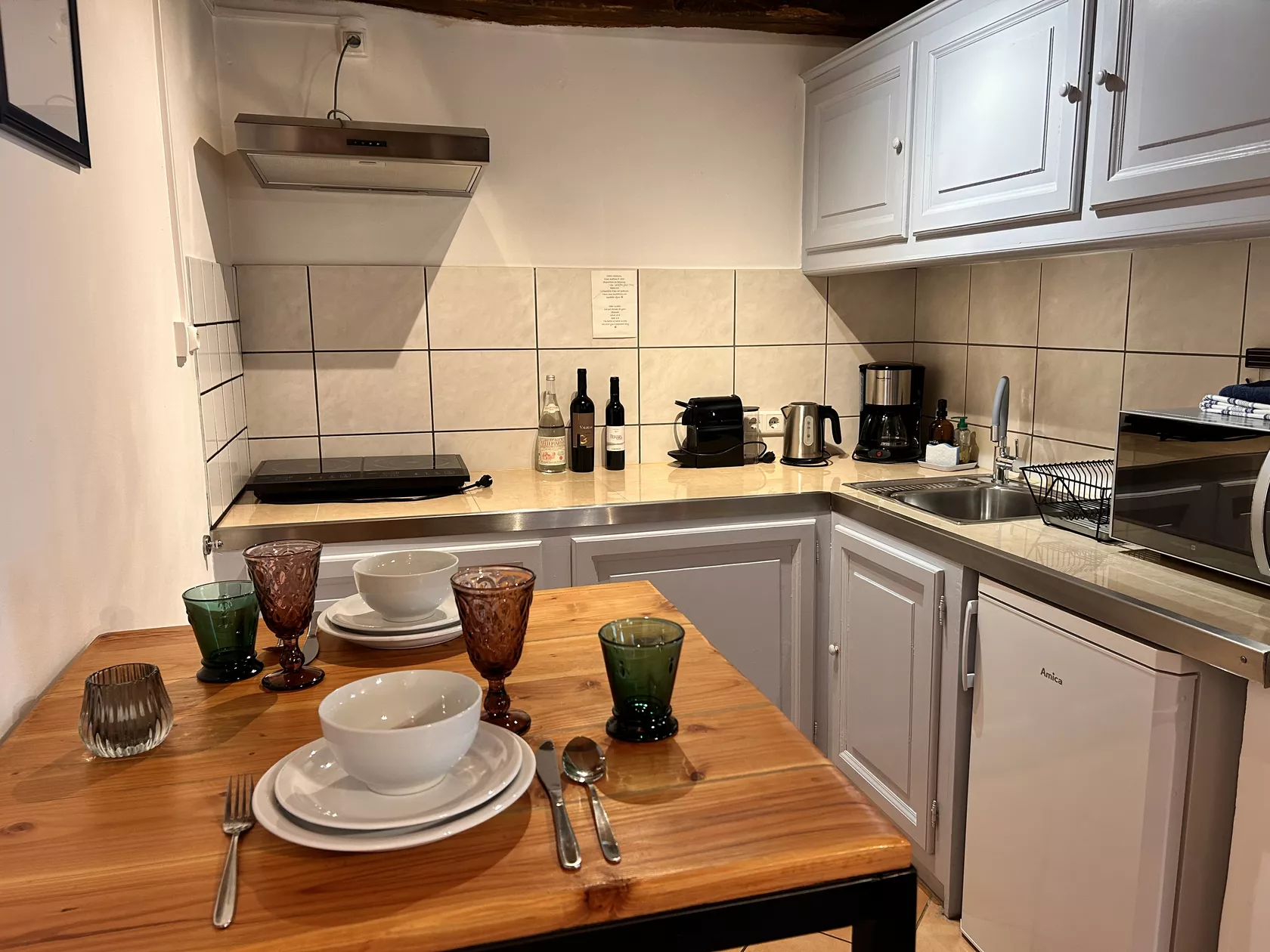 - goed uitgeruste kitchenette met eethoek (koelkast met vriezer, inductiekookplaat, combimagnetron, koffiezetapparaat (filter en Nespresso), waterkoker, broodrooster, servies en bestek)