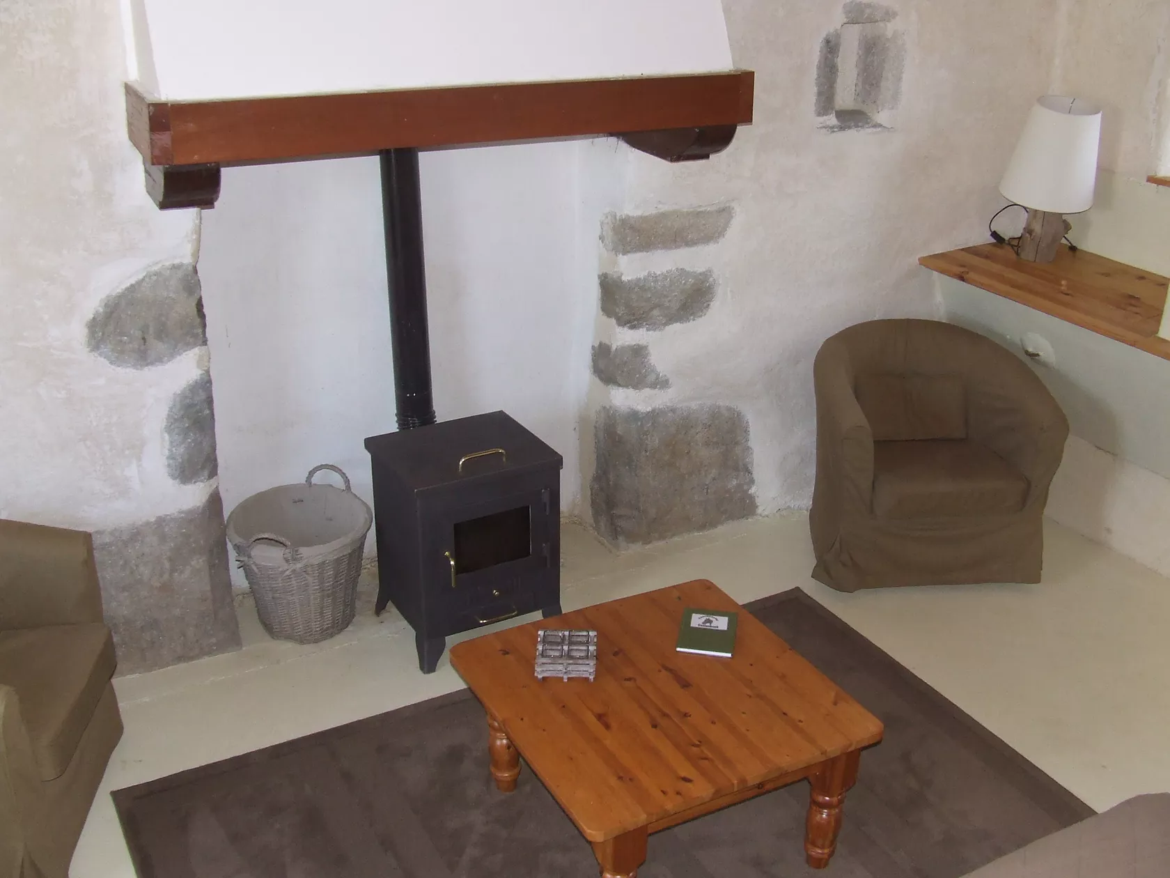 Bankstel, 2 stoelen, houtkachel en aardwarmte in de vloer.