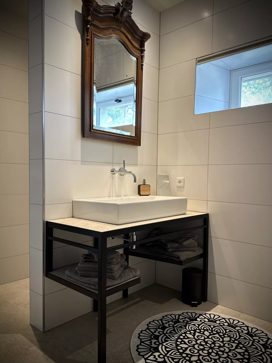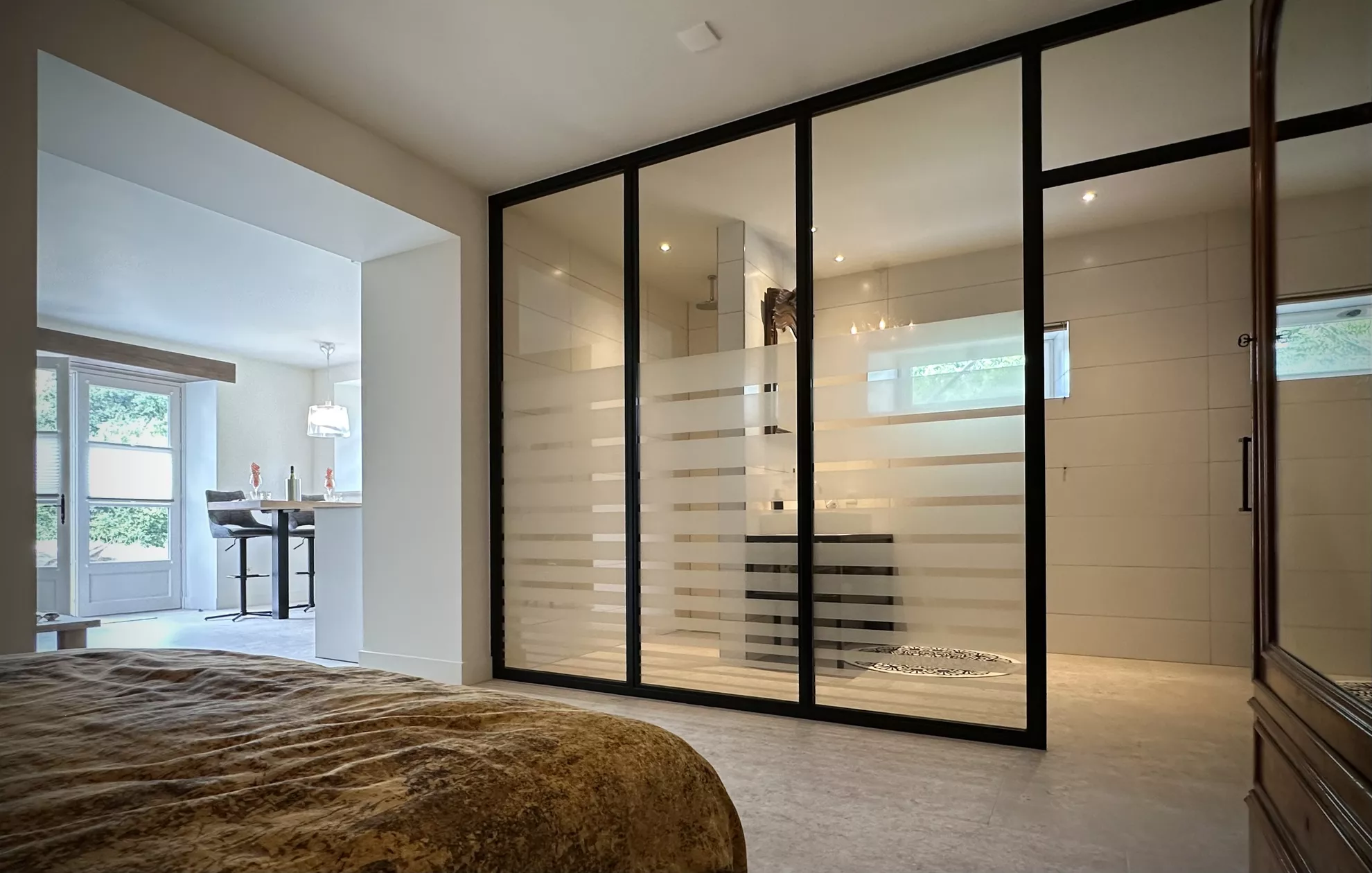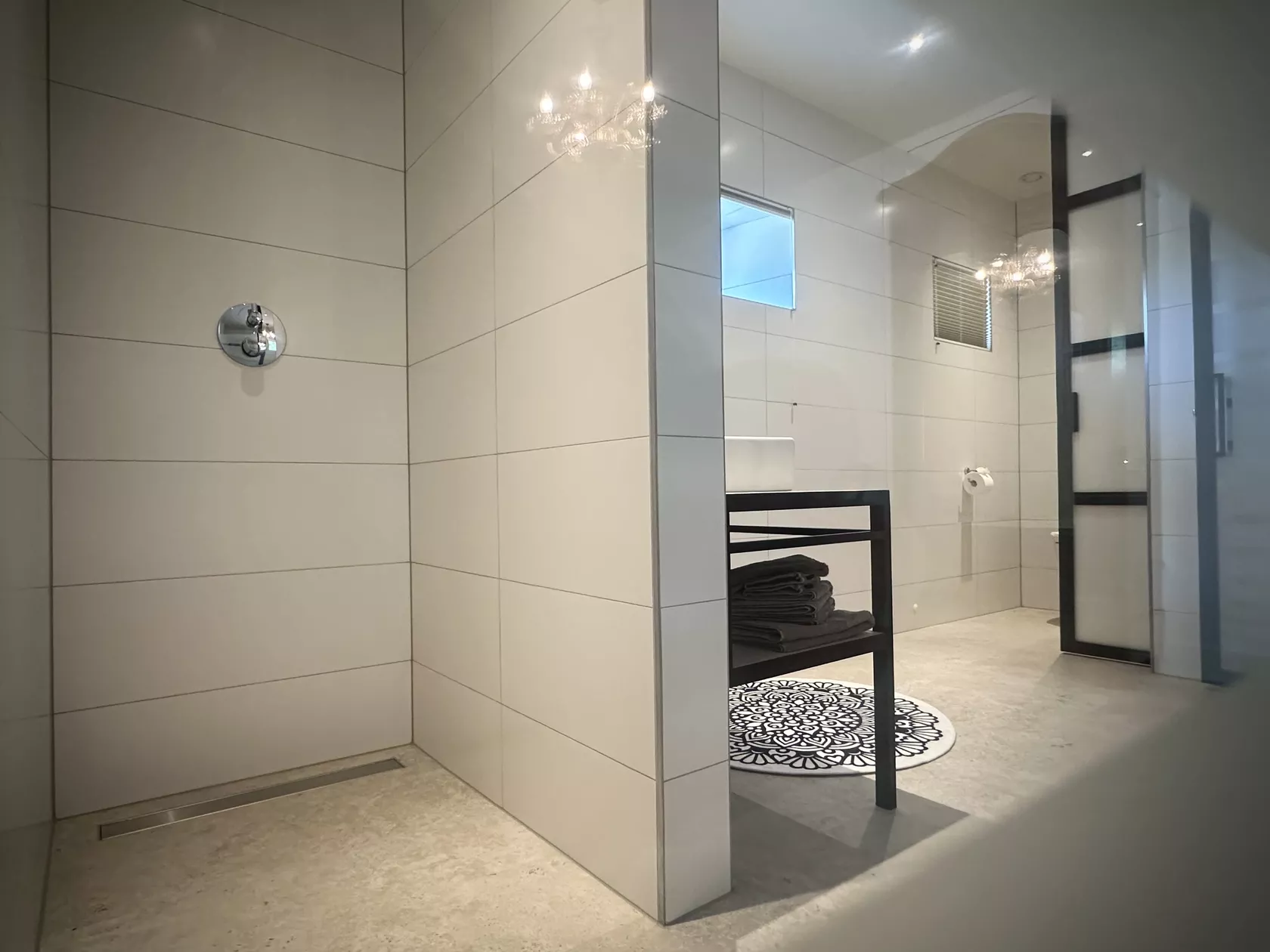 Achter een glazenwand hebben wij een badkamer gerealiseerd met douche, wastafel en toilet..