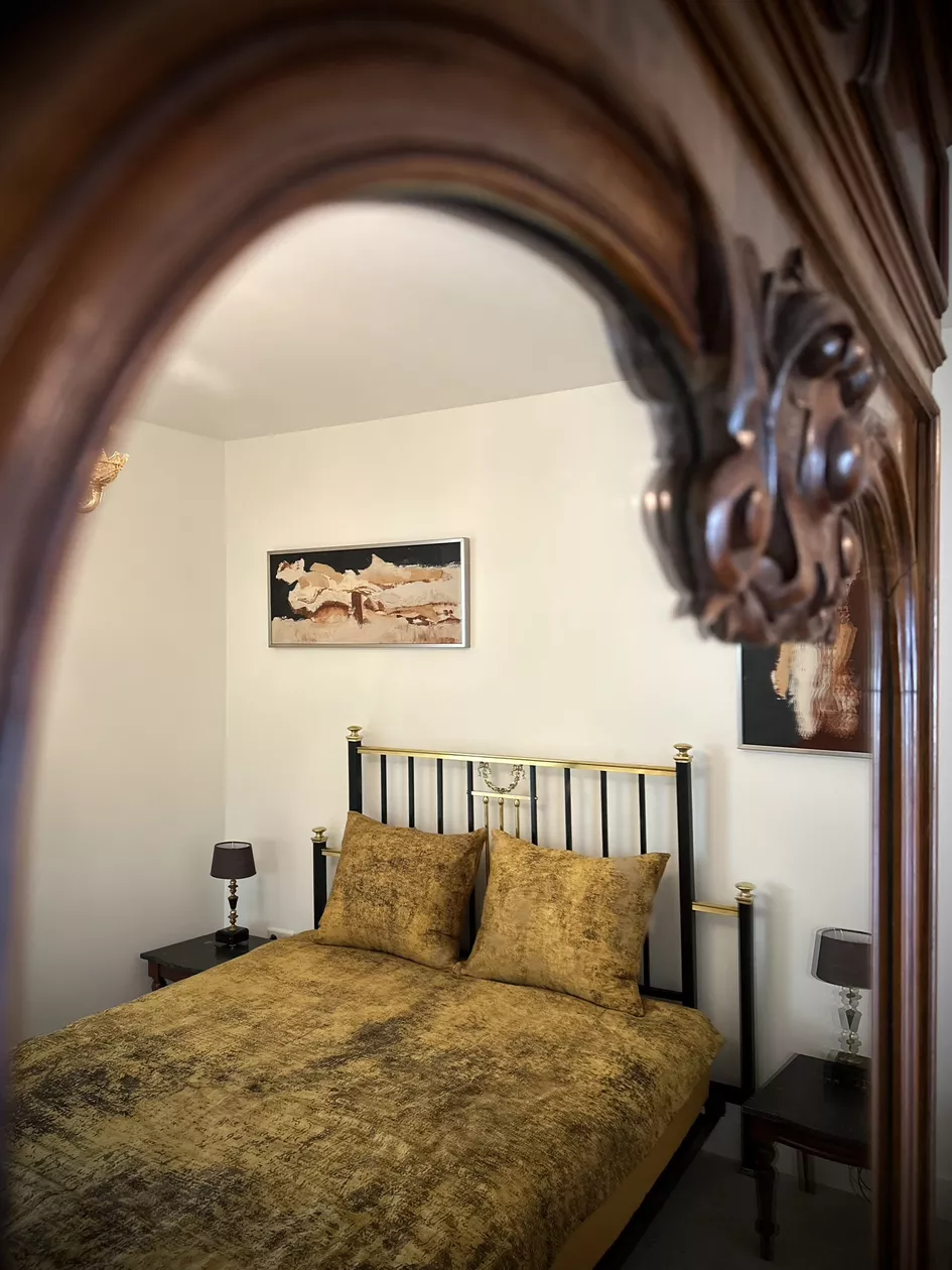 De slaapkamer grenst aan de woonkamer en kan worden afgesloten door middel van zgn.