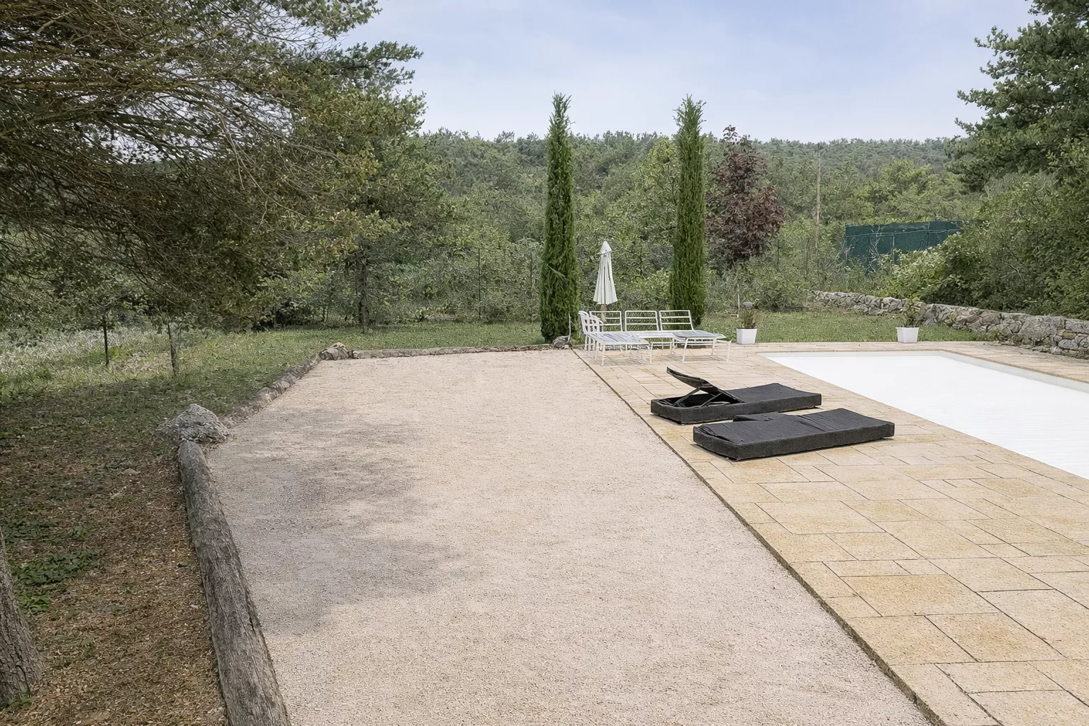 Via de schuifpui komt u in de tuin (784 m2) met overdekt terras, diverse gezellige zitjes, een petanque (jeu de boules) plein en het verwarmde privé zwembad (9.00 x 3,50 x 1,50). Voor de veiligheid van de allerkleinste is het zwembad af te dekken met elektrisch te bedienen afdeklamellen.