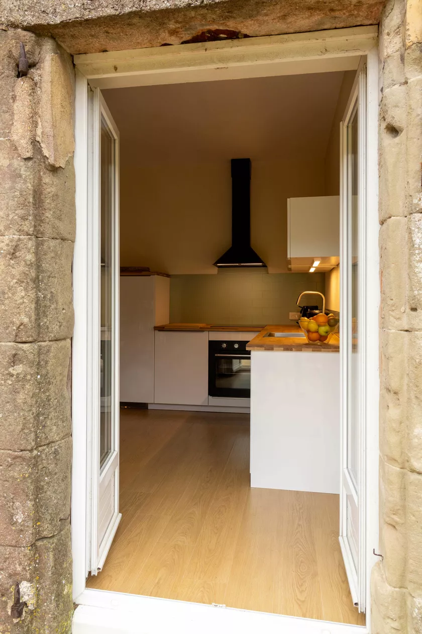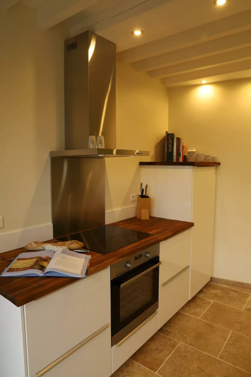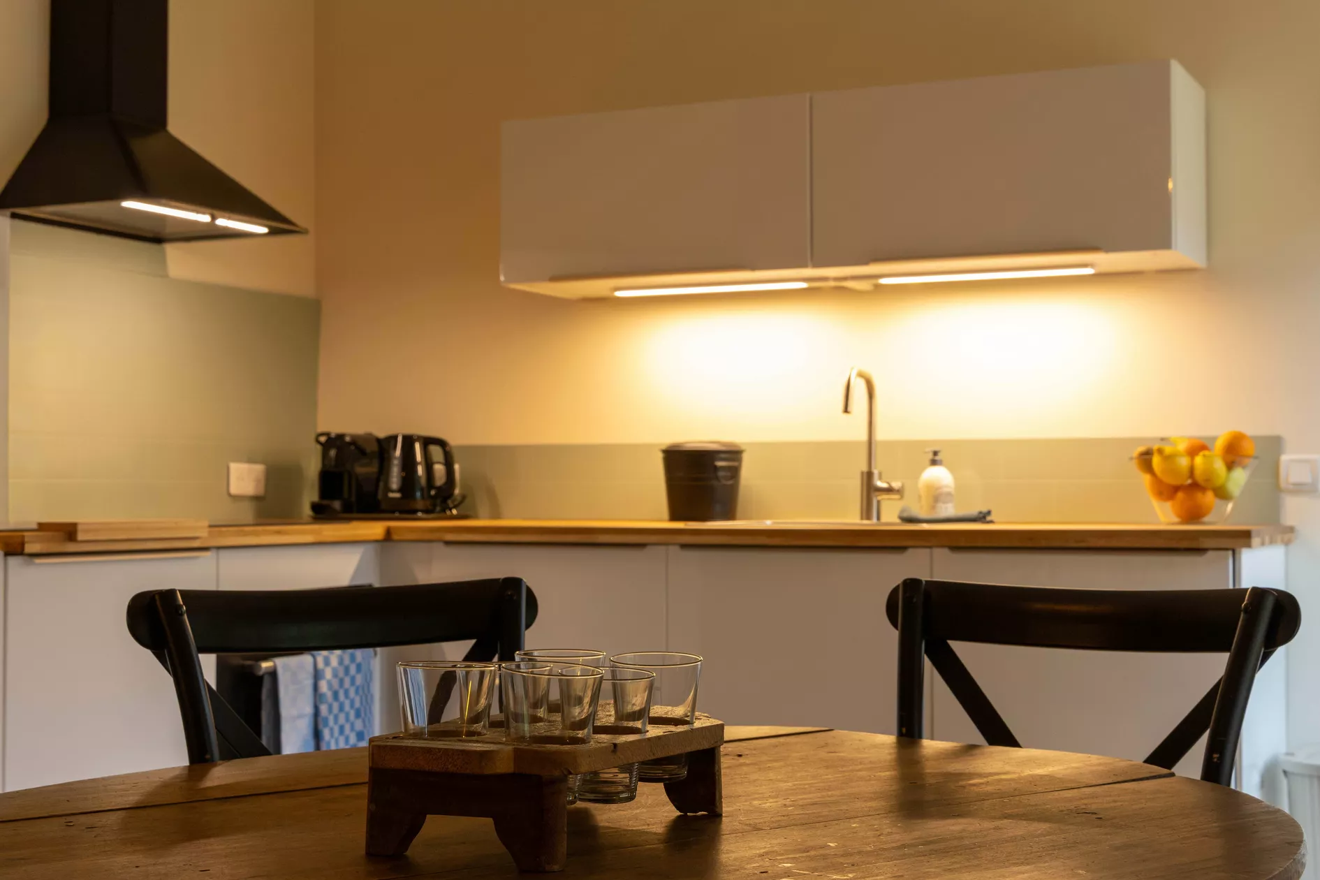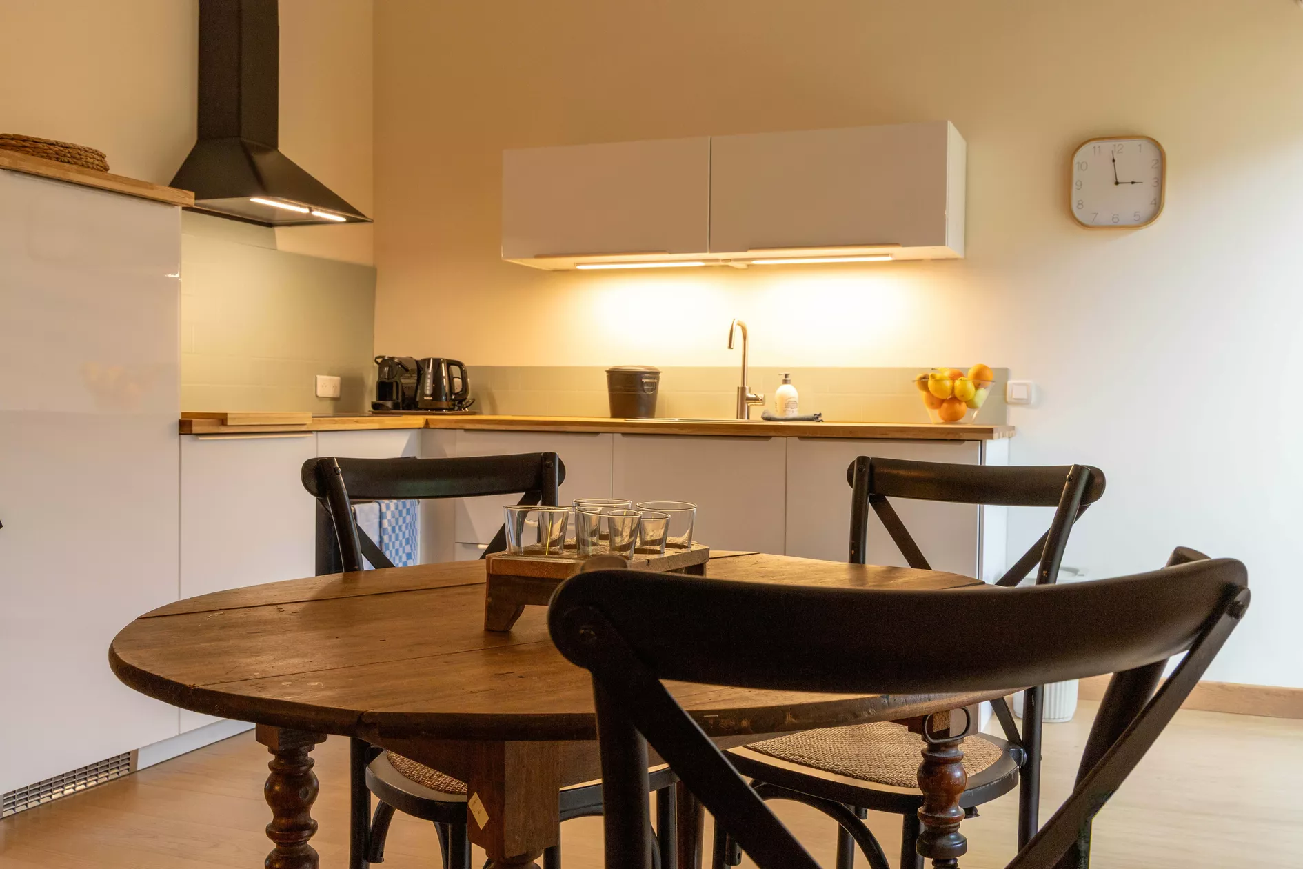 De gezellige woonkamer met open keuken bevindt zich op de eerste verdieping.