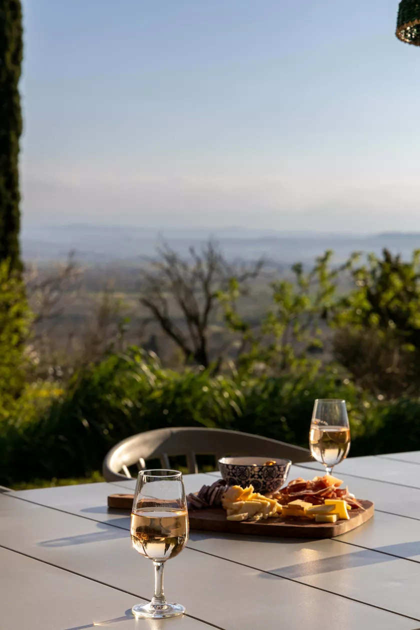 Doordat het huis tegen een heuvel is gebouwd, loop je vanuit de woonkamer en keuken zo het terras op naar de royale privé-tuin van deze gîte. Hier geniet je van een spectaculair uitzicht over de Malepère-wijnstreek en de vallei van Carcassonne.