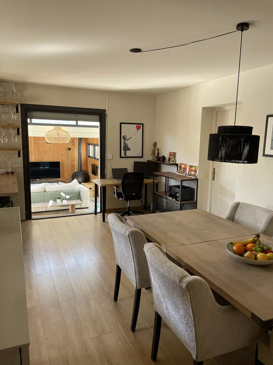 Binnen vind je een ruime eetkamer met een grote eettafel voor zes personen, en een gezellige zithoek met houten wand, natuurstenen vloer en knusse houthaard. De volledig ingerichte keuken biedt alles wat je nodig hebt om comfortabel te verblijven.