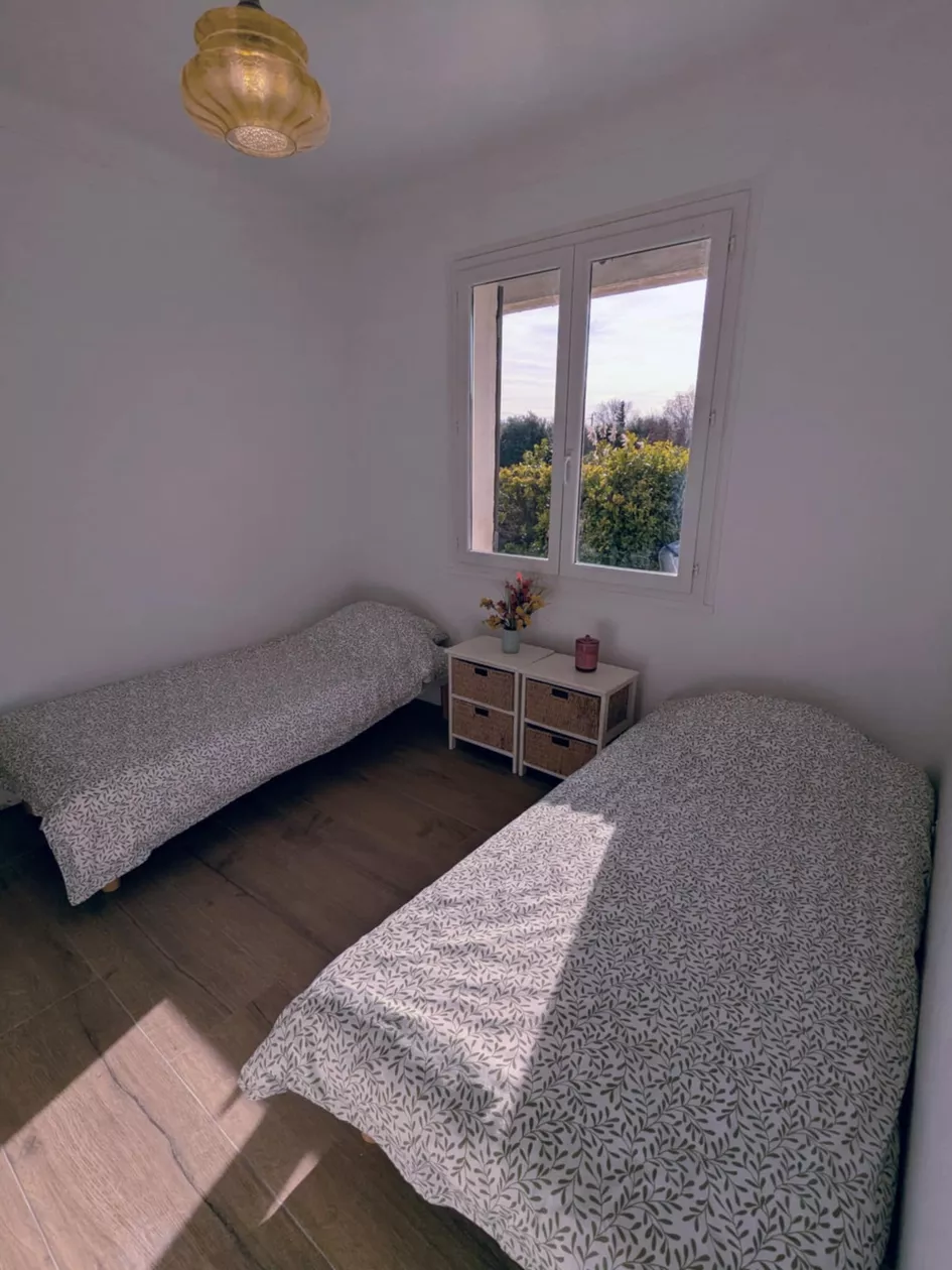 Het huis heeft 3 slaapkamers op de begane grond: twee met tweepersoonsbedden (160x200 cm) en één met twee eenpersoonsbedden (90x190 cm).