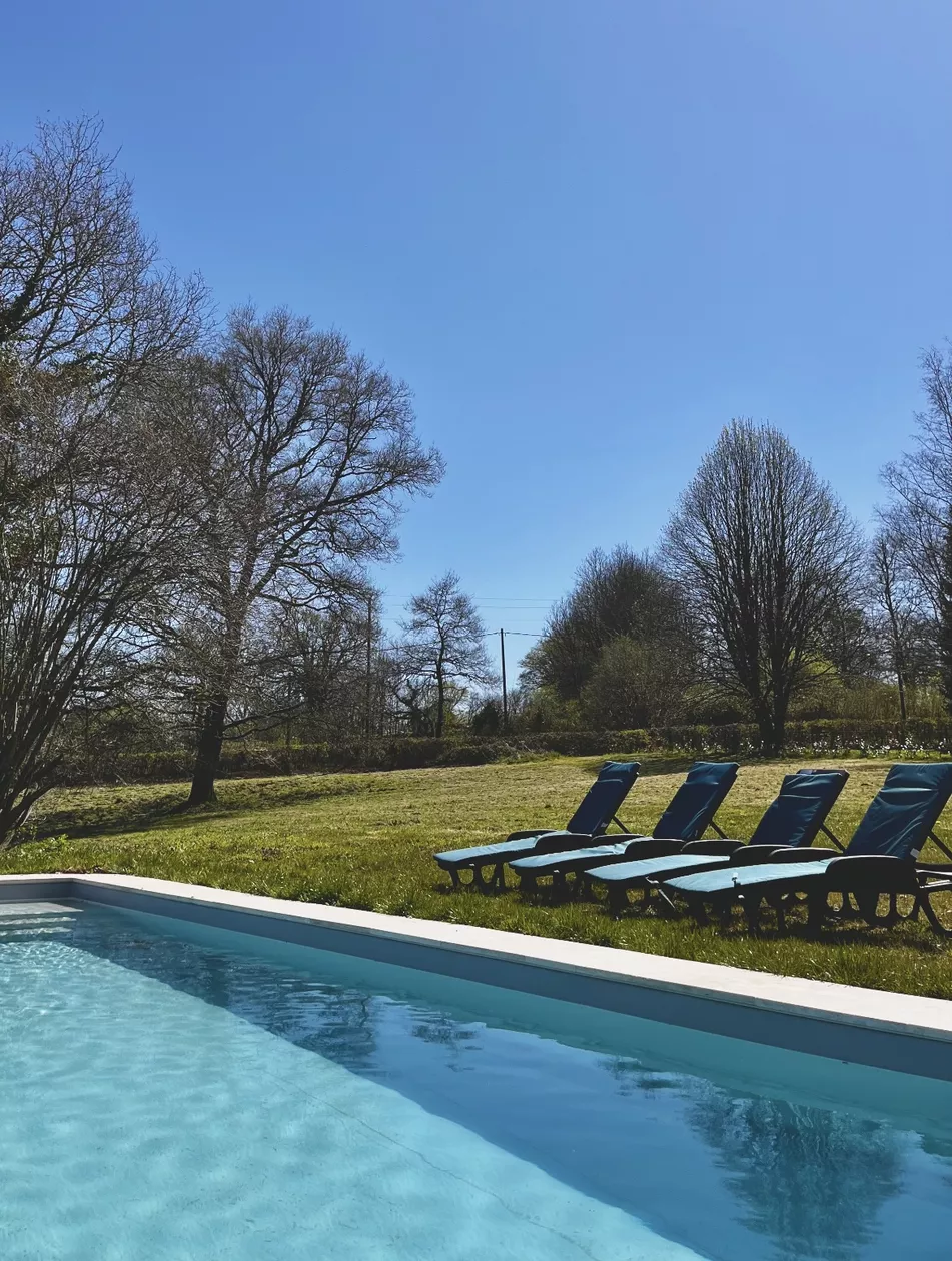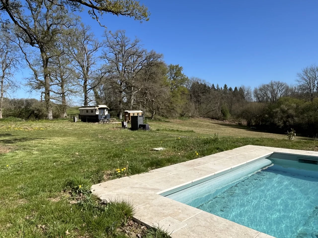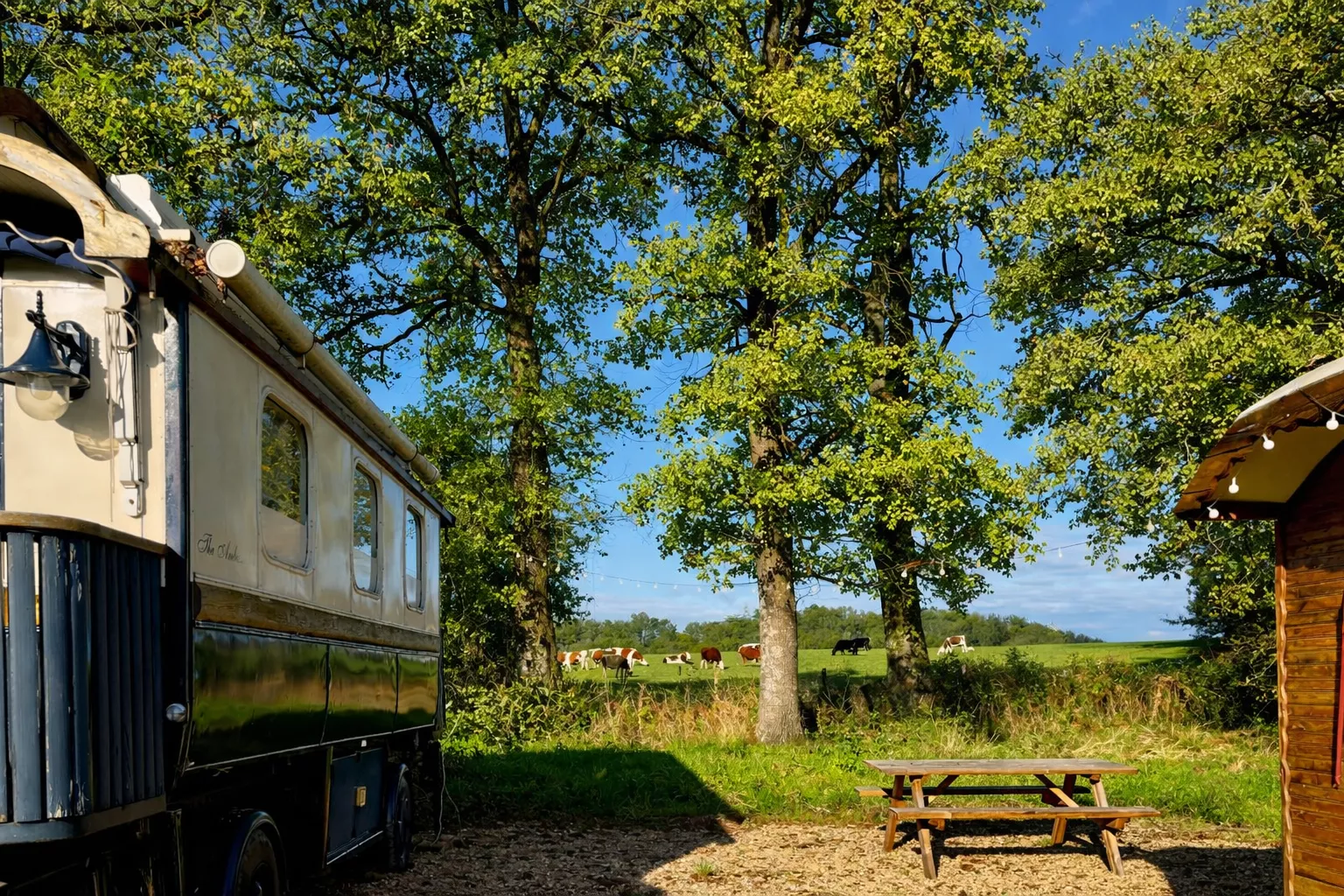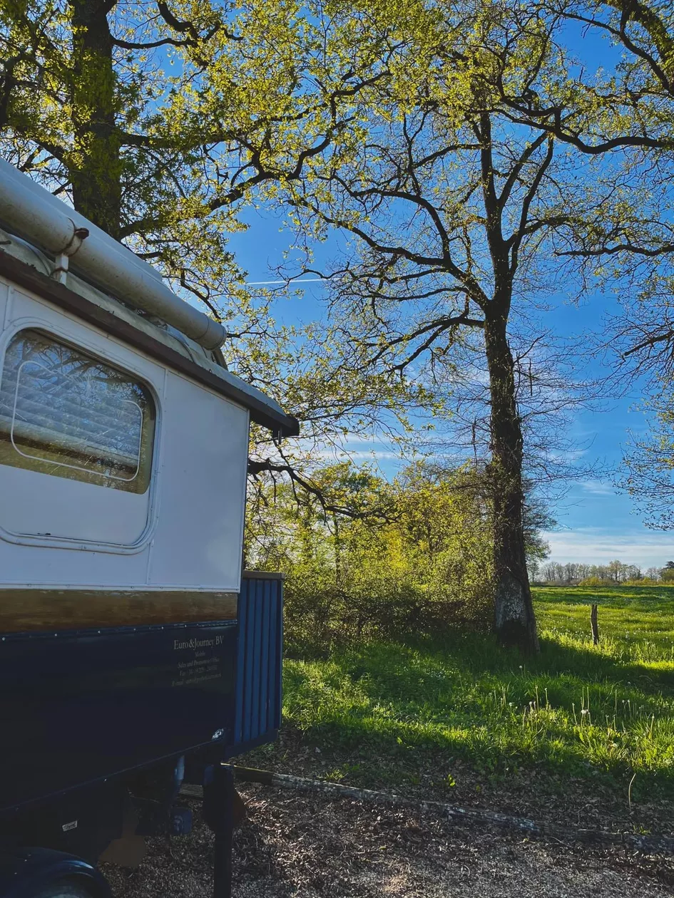 Op het Domaine de Gare Blond staat deze unieke roulotte uit 1922 met een heerlijk zwembad op het terrein, prachtig uitzicht over het weiland.