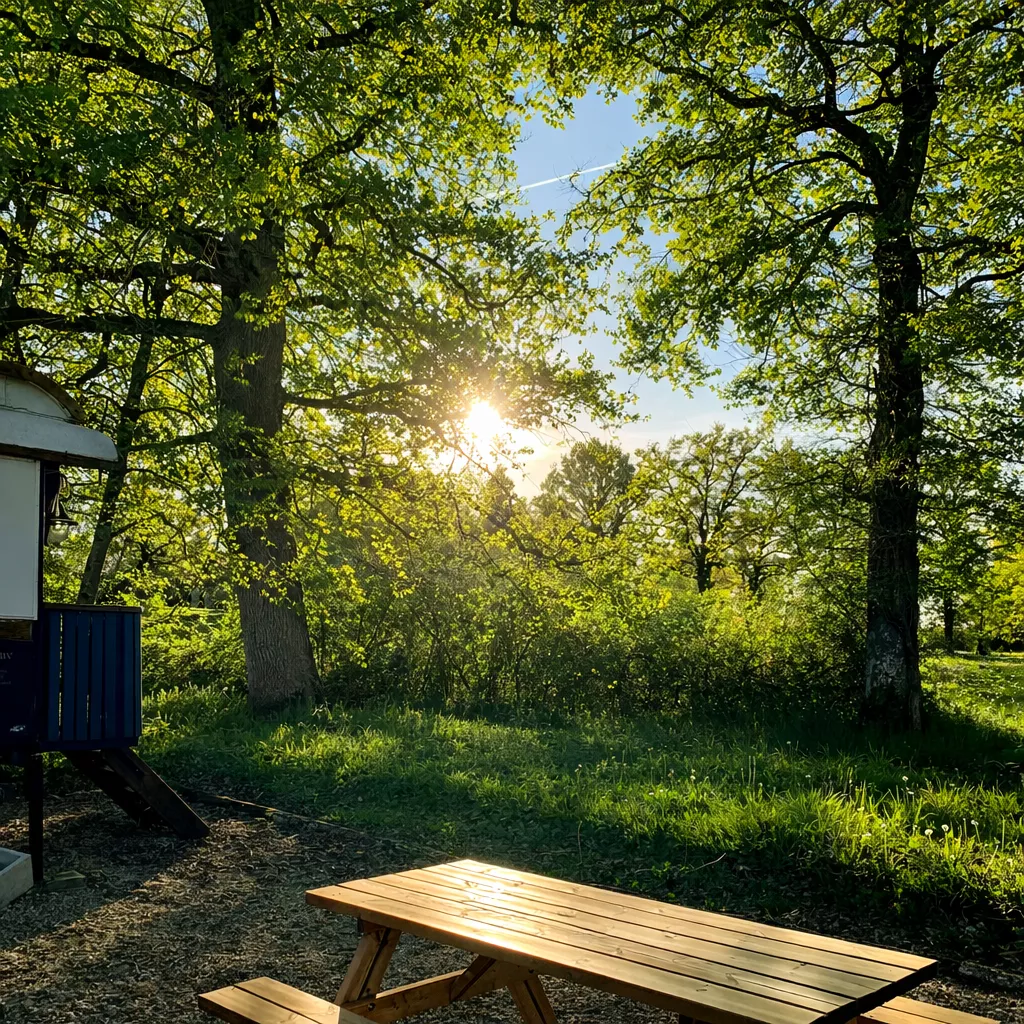 Aanwezig: een buiten eethoek, gaskookplaat, gootsteen, toilet en wastafel en 2 tweepersoonsbedden. Verderop op het terrein is toiletgebouwtje met douche, toilet en wastafel.