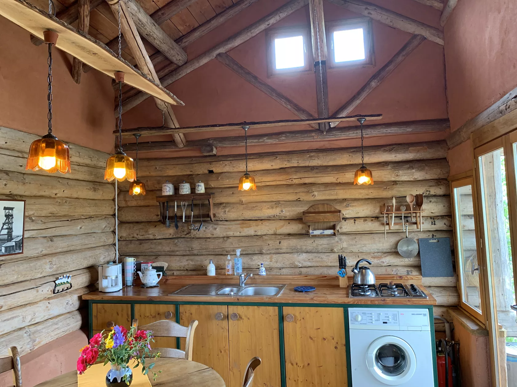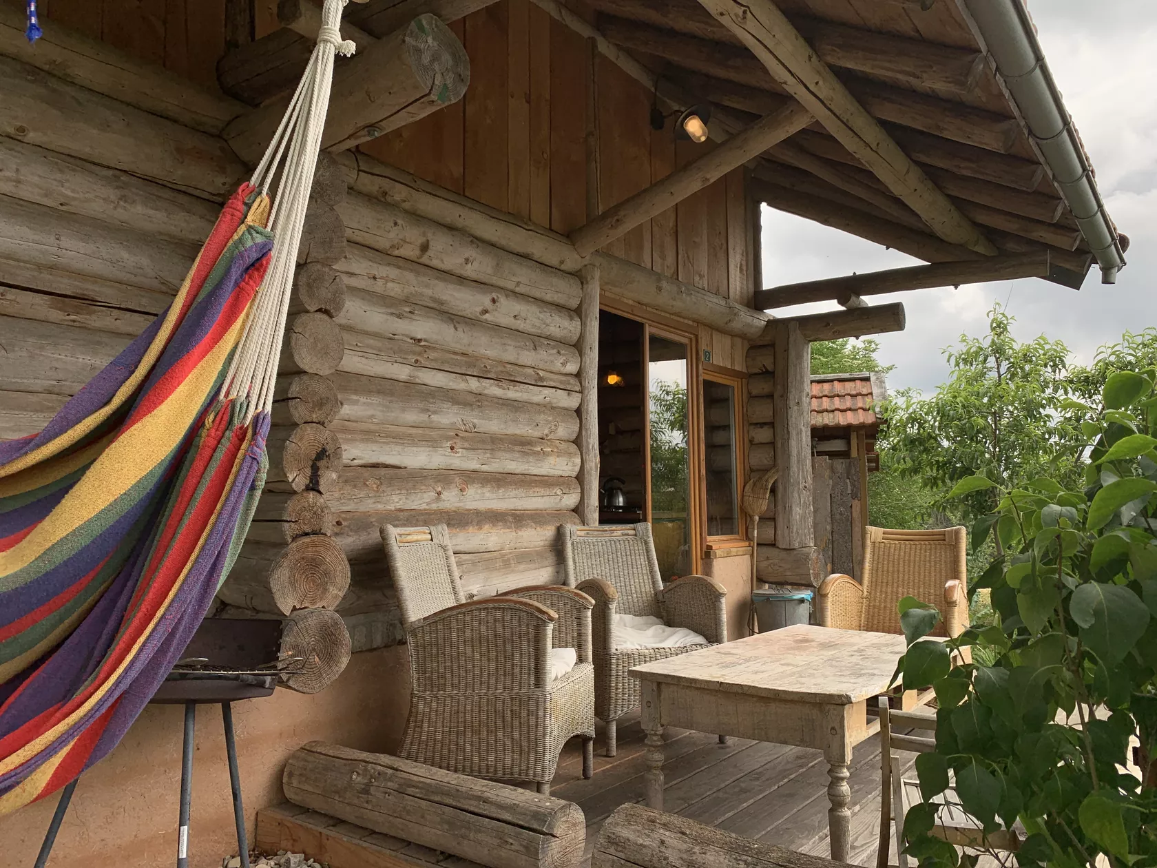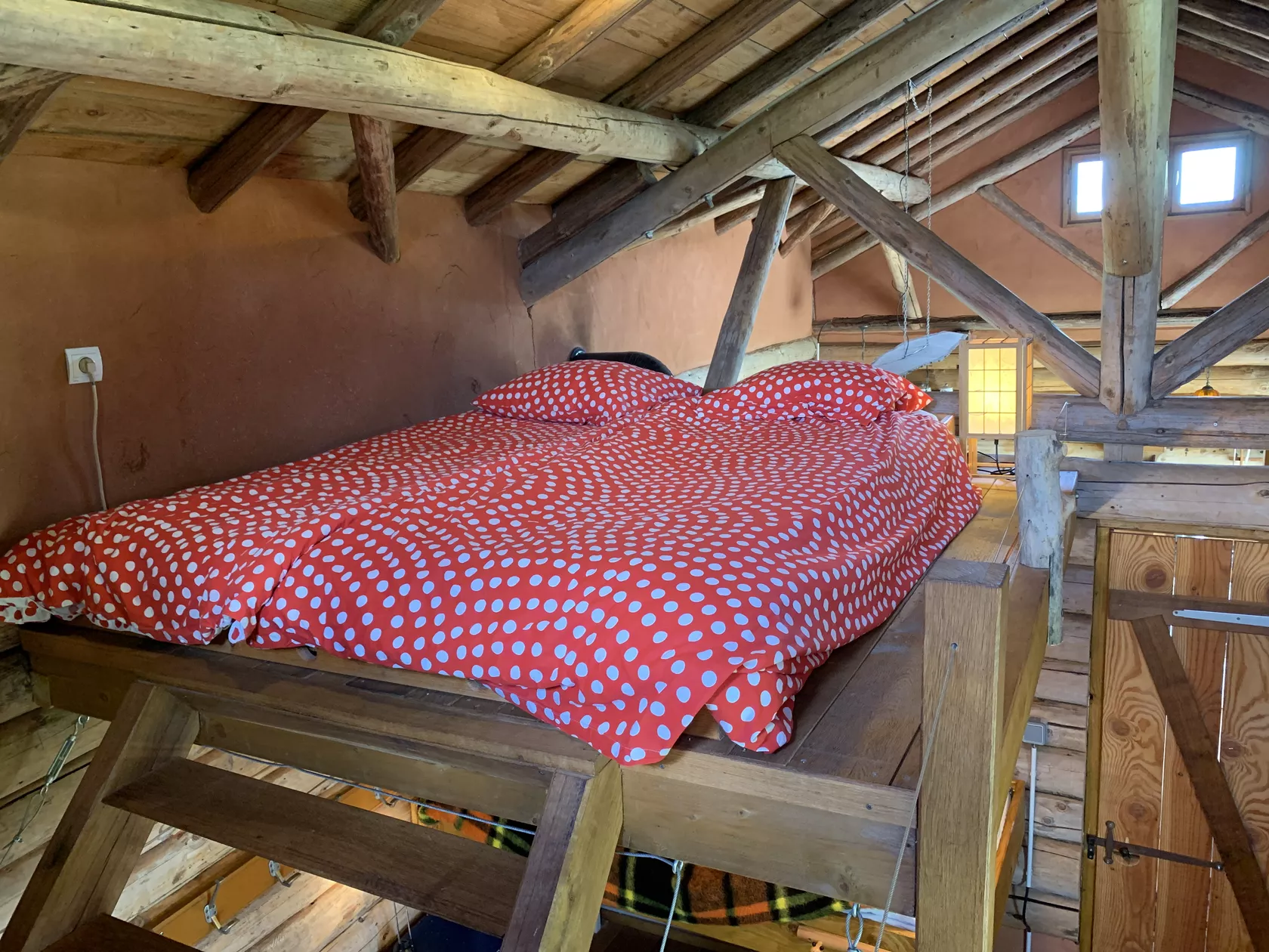De blokhut is gebouwd van natuurlijke materialen, vooral hout en leem, dit zorgt voor een warme en rustieke sfeer.