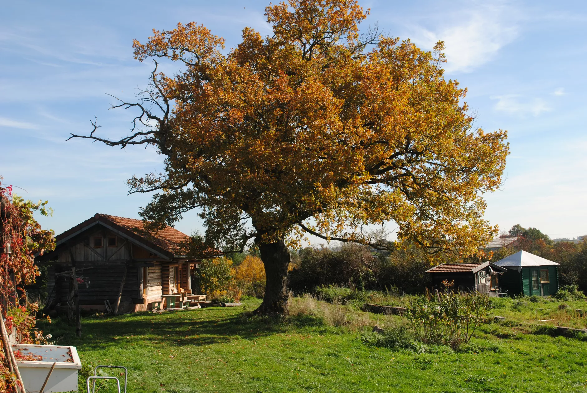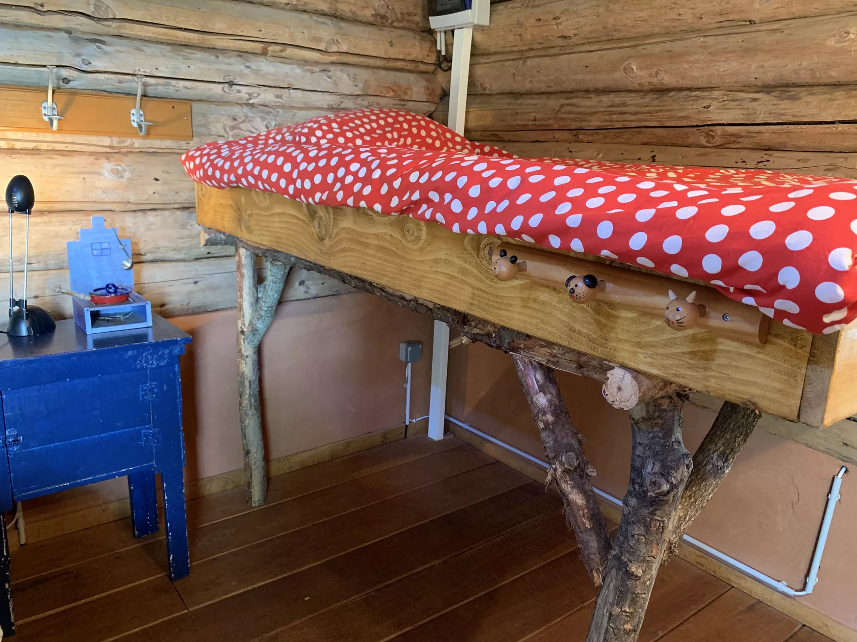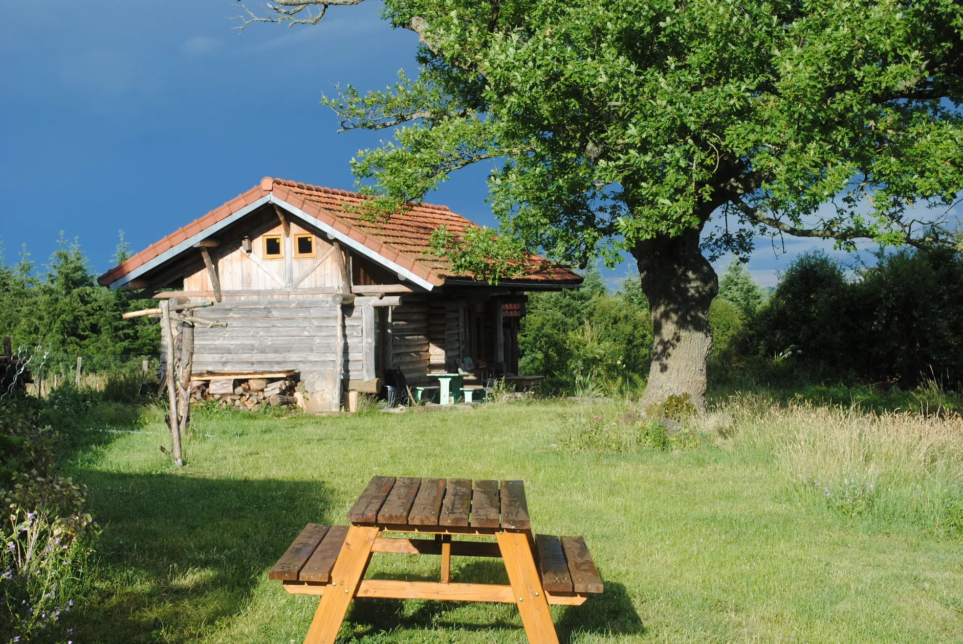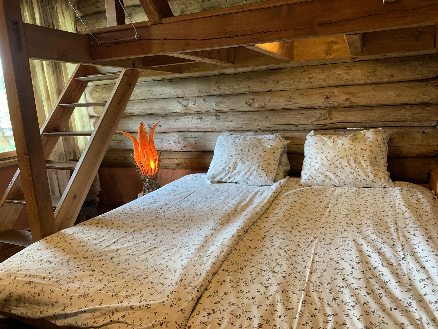 De blokhut is gebouwd van natuurlijke materialen, vooral hout en leem, dit zorgt voor een warme en rustieke sfeer.