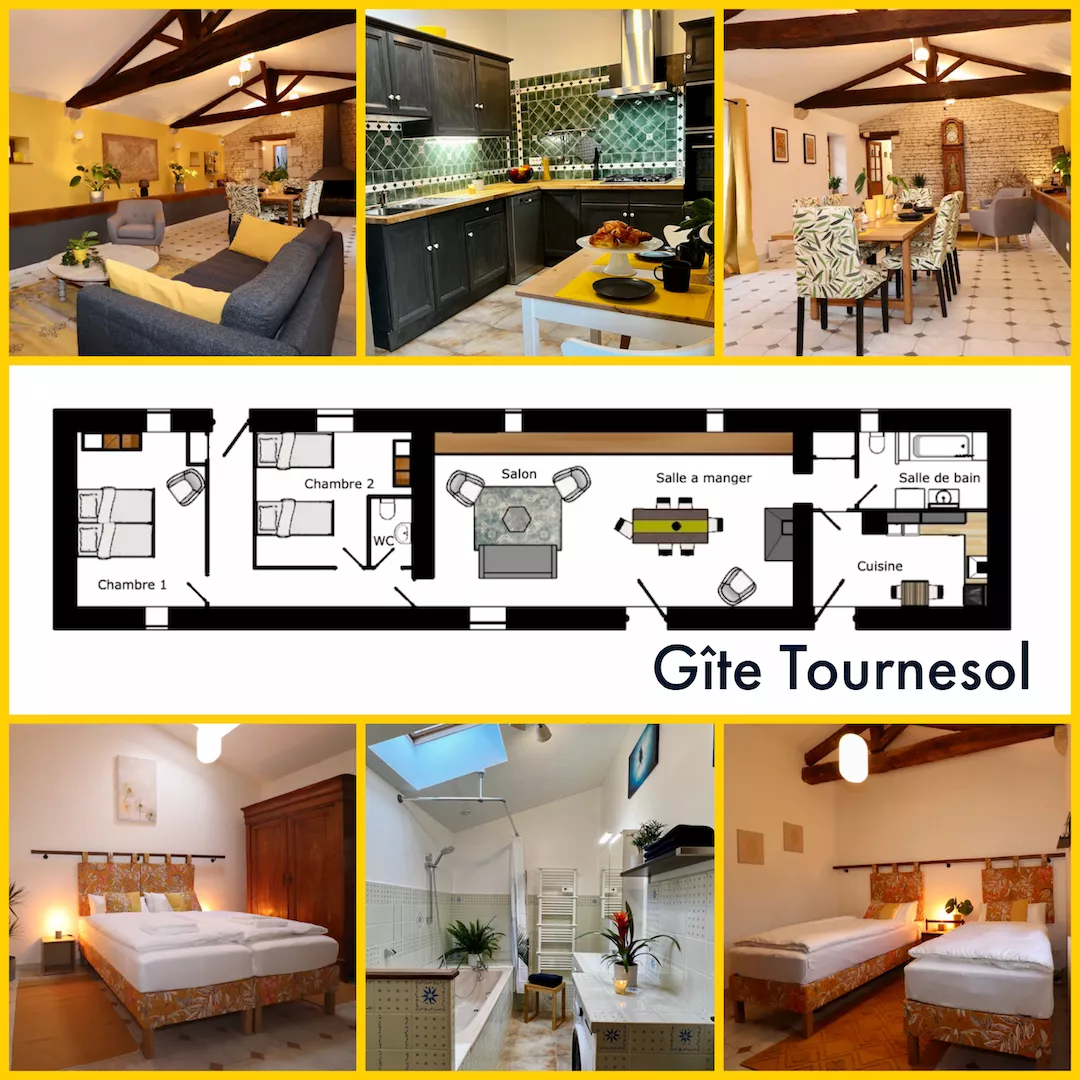 Gîte Tournesol is een lichte en ruime gelijkvloerse accommodatie van 105 m², geïnspireerd op de omliggende zonnebloemvelden. Het beschikt over een volledig uitgeruste keuken, een royale woonkamer met open haard en slaapbank, twee warme en uitnodigende slaapkamers en een privéterras met uitzicht op open landbouwgrond. De indeling en sfeer maken het een uitnodigende plek om samen te komen, te koken en te ontspannen.