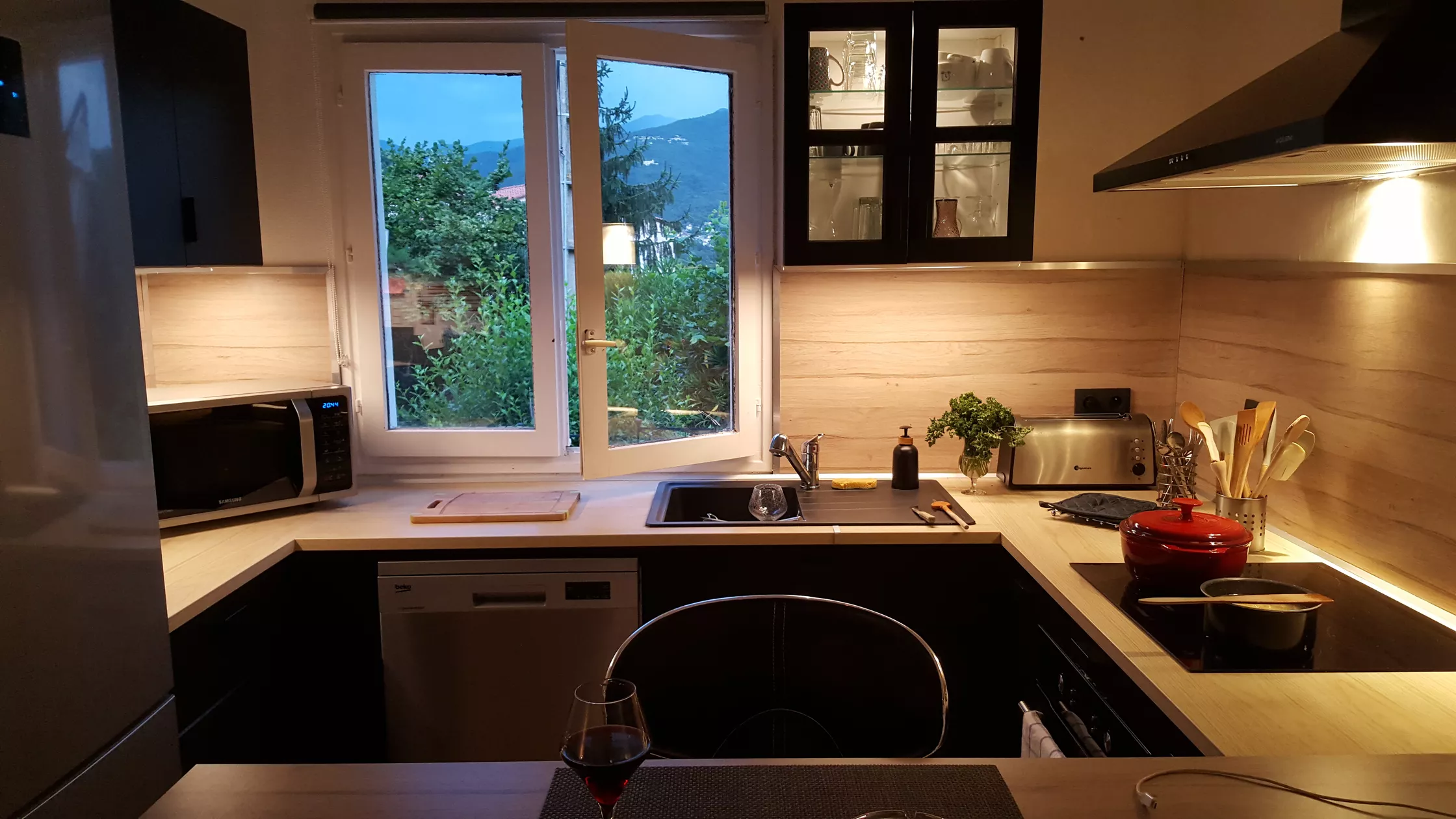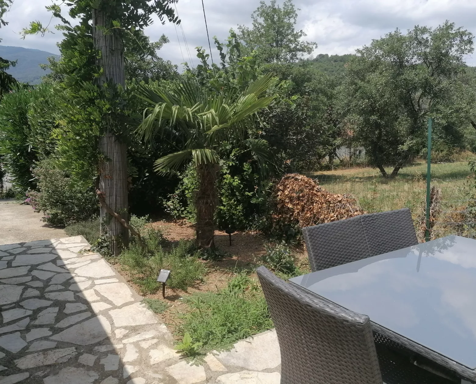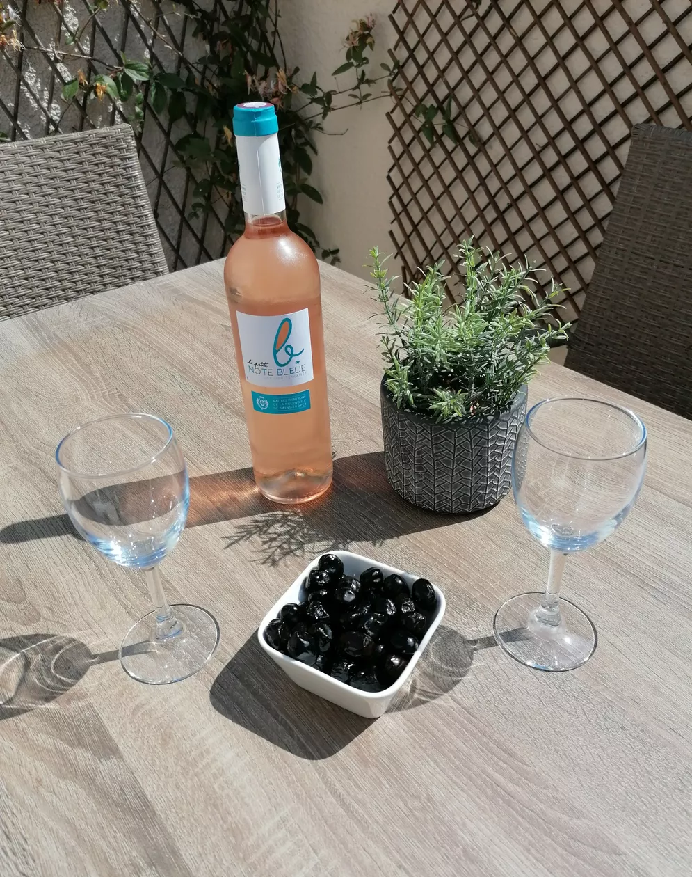 Barbecue/plancha. Ligstoelen.