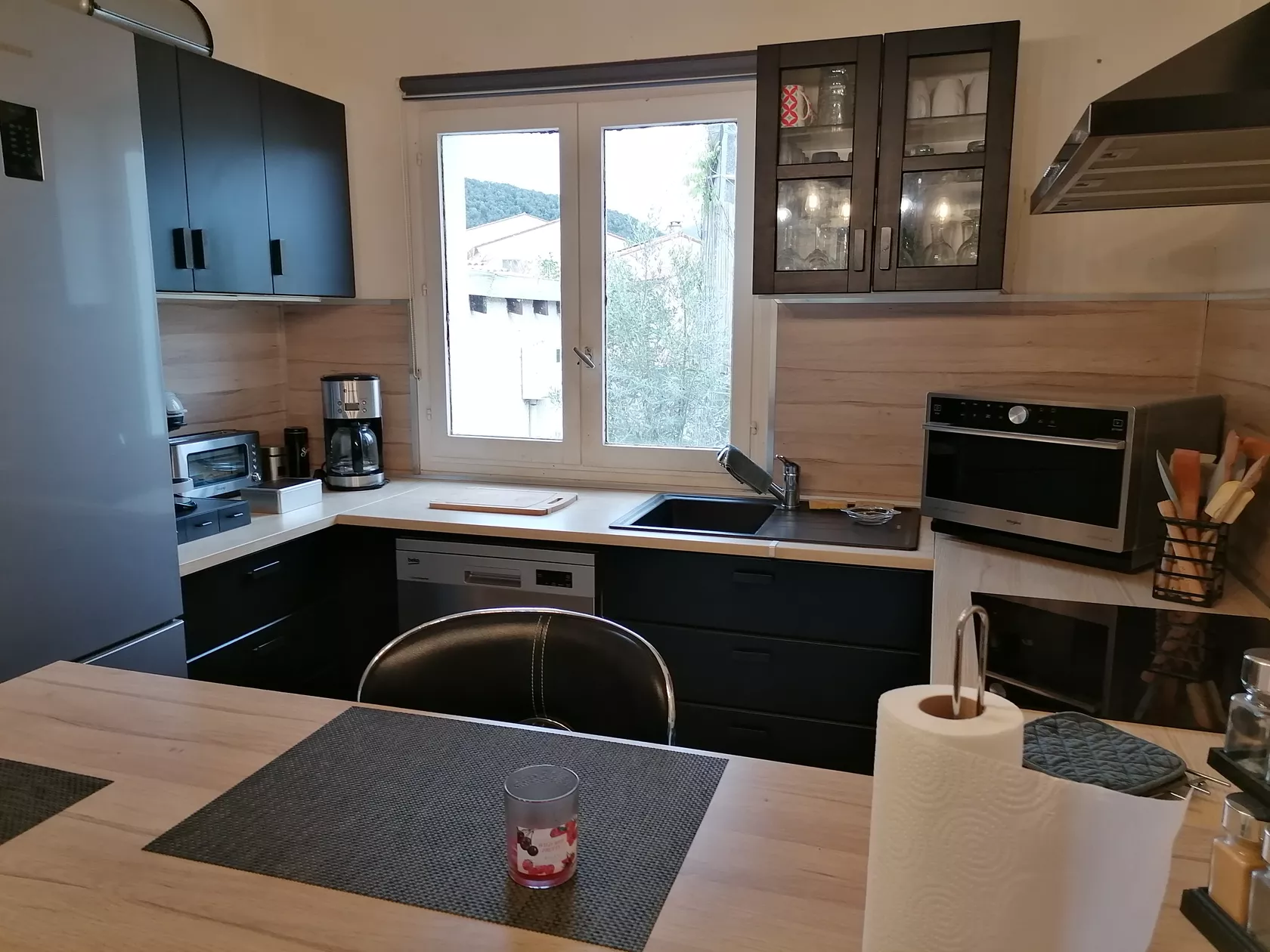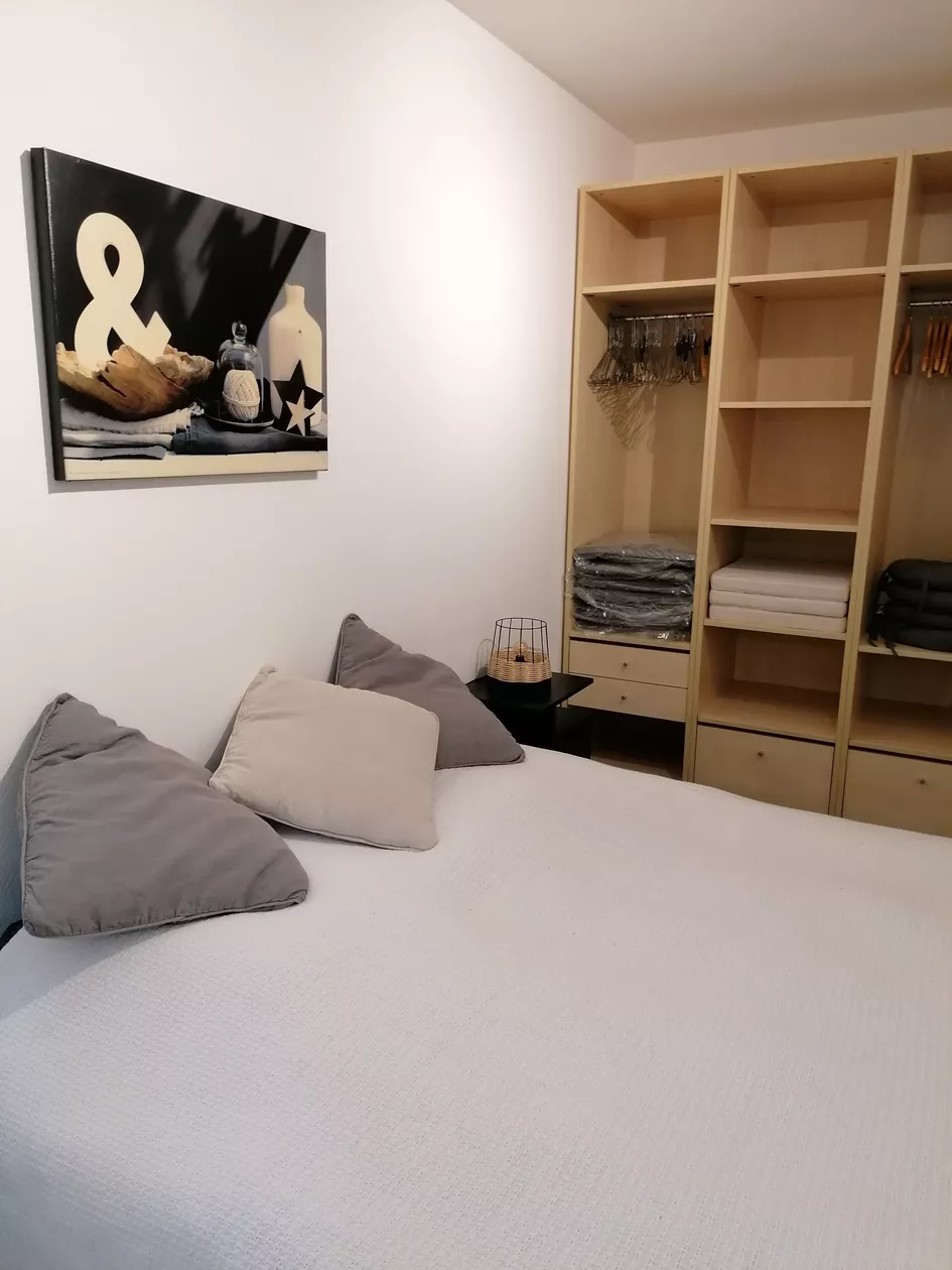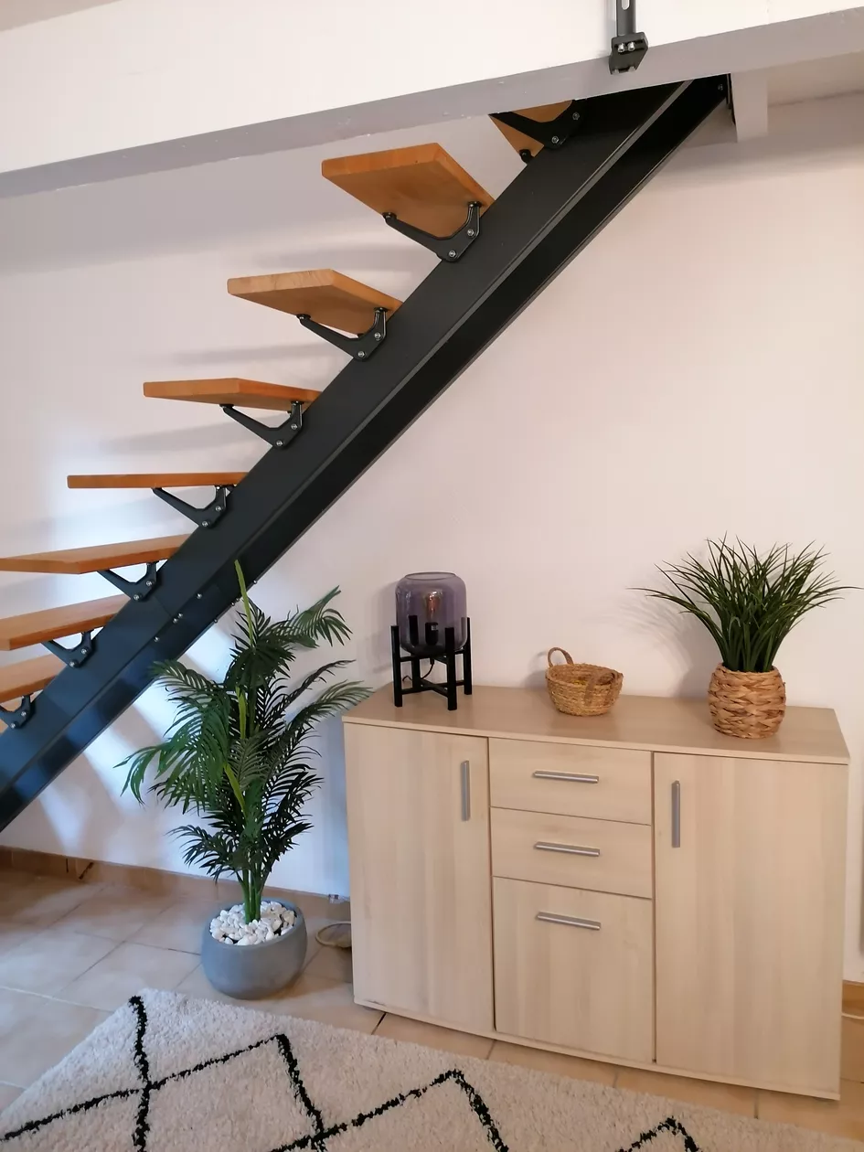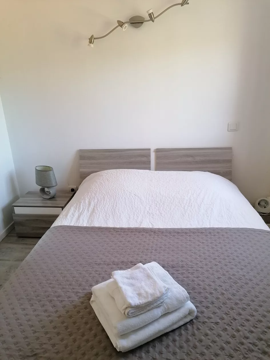 Huis aan 3 kanten, bestaande uit volledig ingerichte open keuken (oven, multifunctionele magnetron, koelkast, vriezer, koffiezetapparaat, enz.), salon/woonkamer (60 m2), 3 slaapkamers (1x 1.60 cm op begane grond + 2x 1.40 cm boven onder helling).