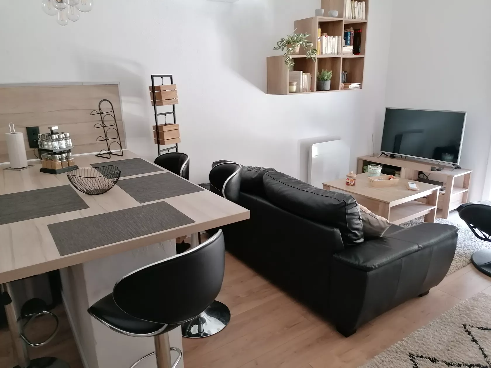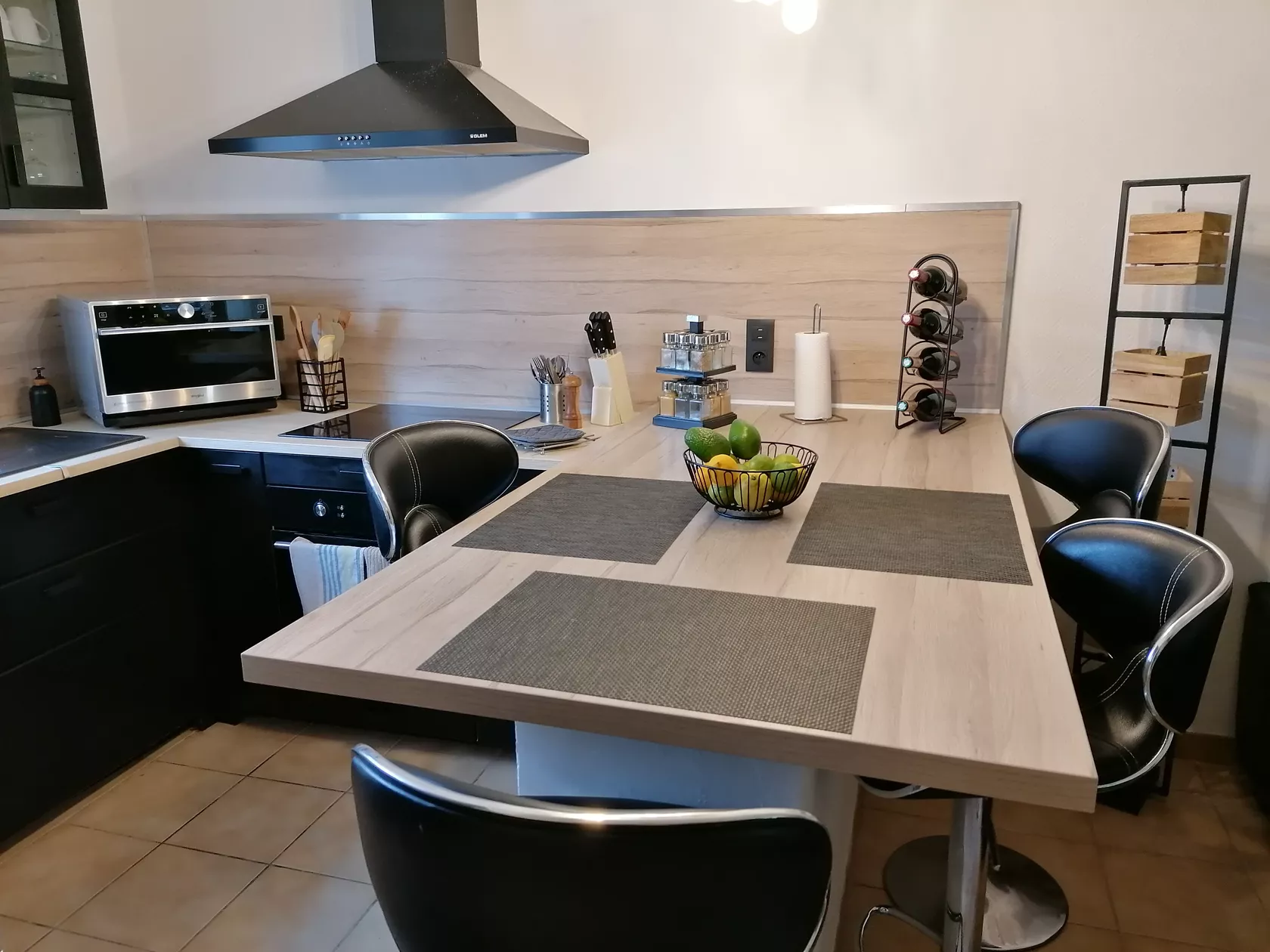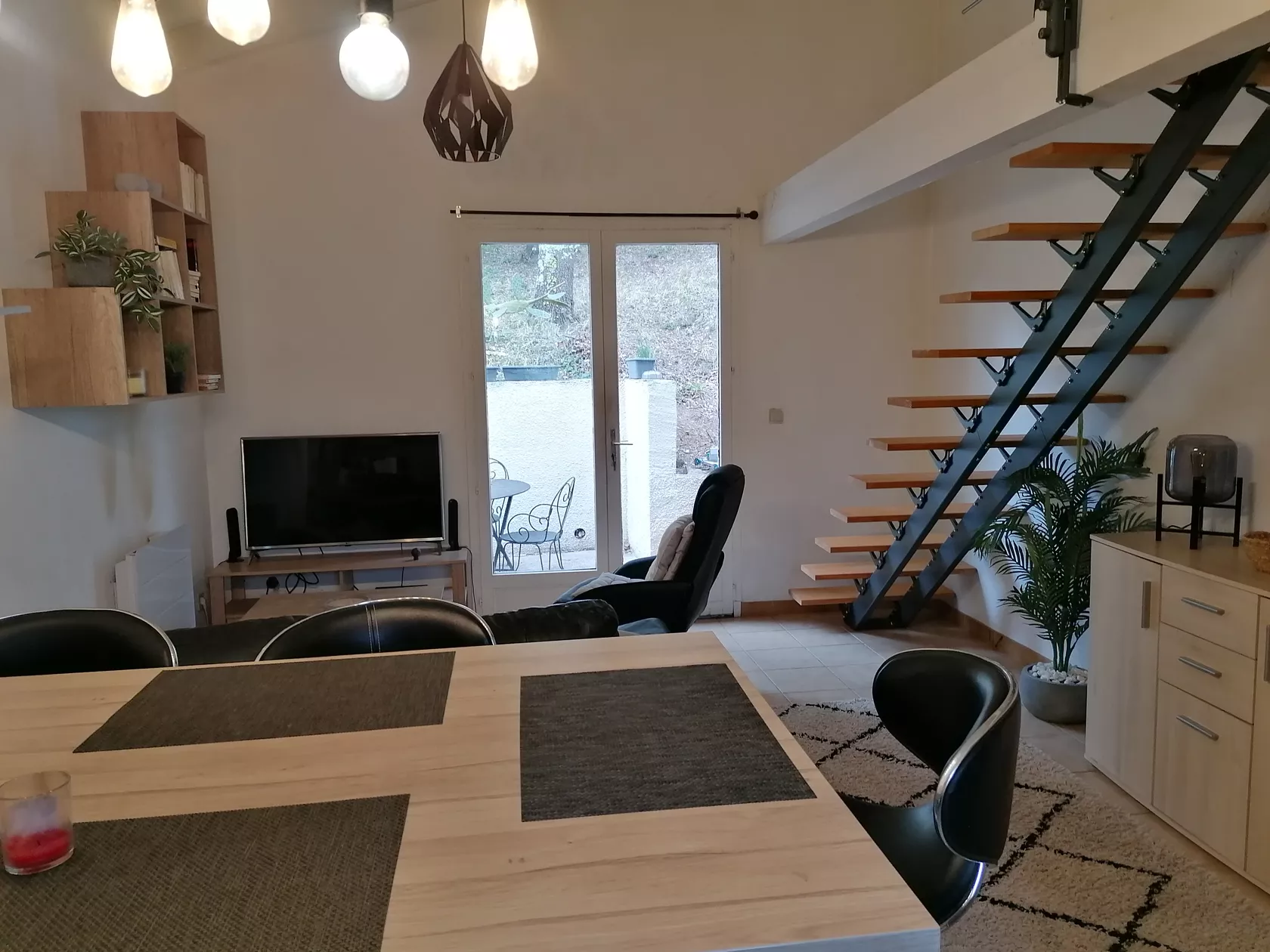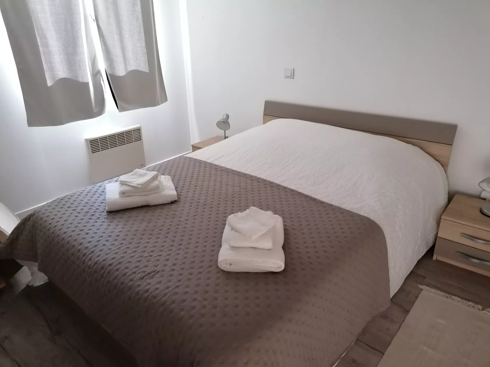 Huis aan 3 kanten, bestaande uit volledig ingerichte open keuken (oven, multifunctionele magnetron, koelkast, vriezer, koffiezetapparaat, enz.), salon/woonkamer (60 m2), 3 slaapkamers (1x 1.60 cm op begane grond + 2x 1.40 cm boven onder helling).