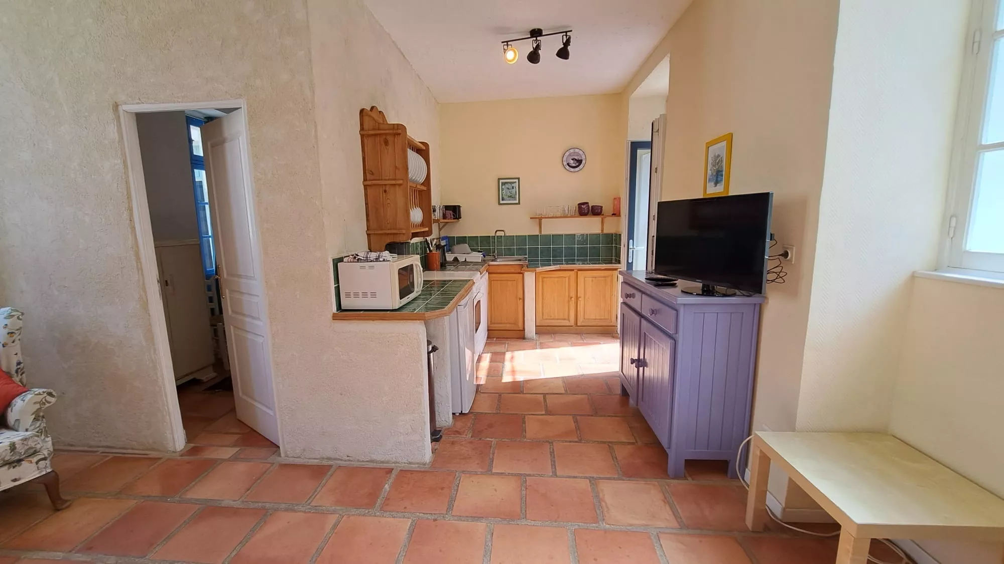 Het huis is ongeveer 50 m² groot en heeft een goed uitgeruste keuken met vaatwasser, fornuis en magnetron.