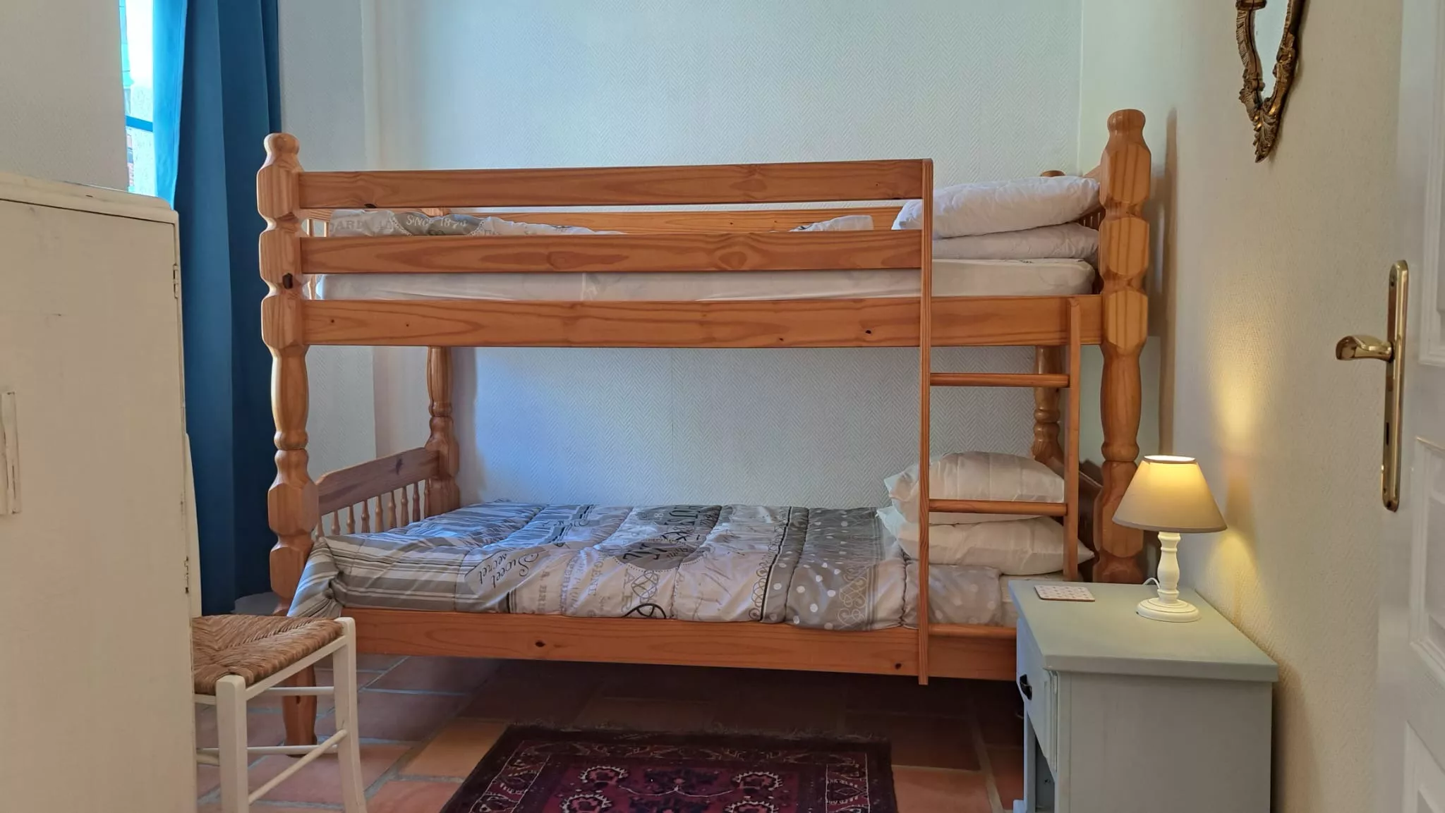 Stapelbed slaapkamer (standaard eenpersoonsbedden 90 x 190 cm) met ruimte voor extra kinderbed of babybedje.