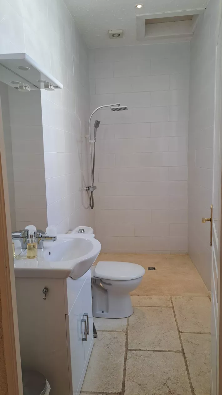 Ruime doucheruimte met inloopdouche/wc in Italiaanse stijl.