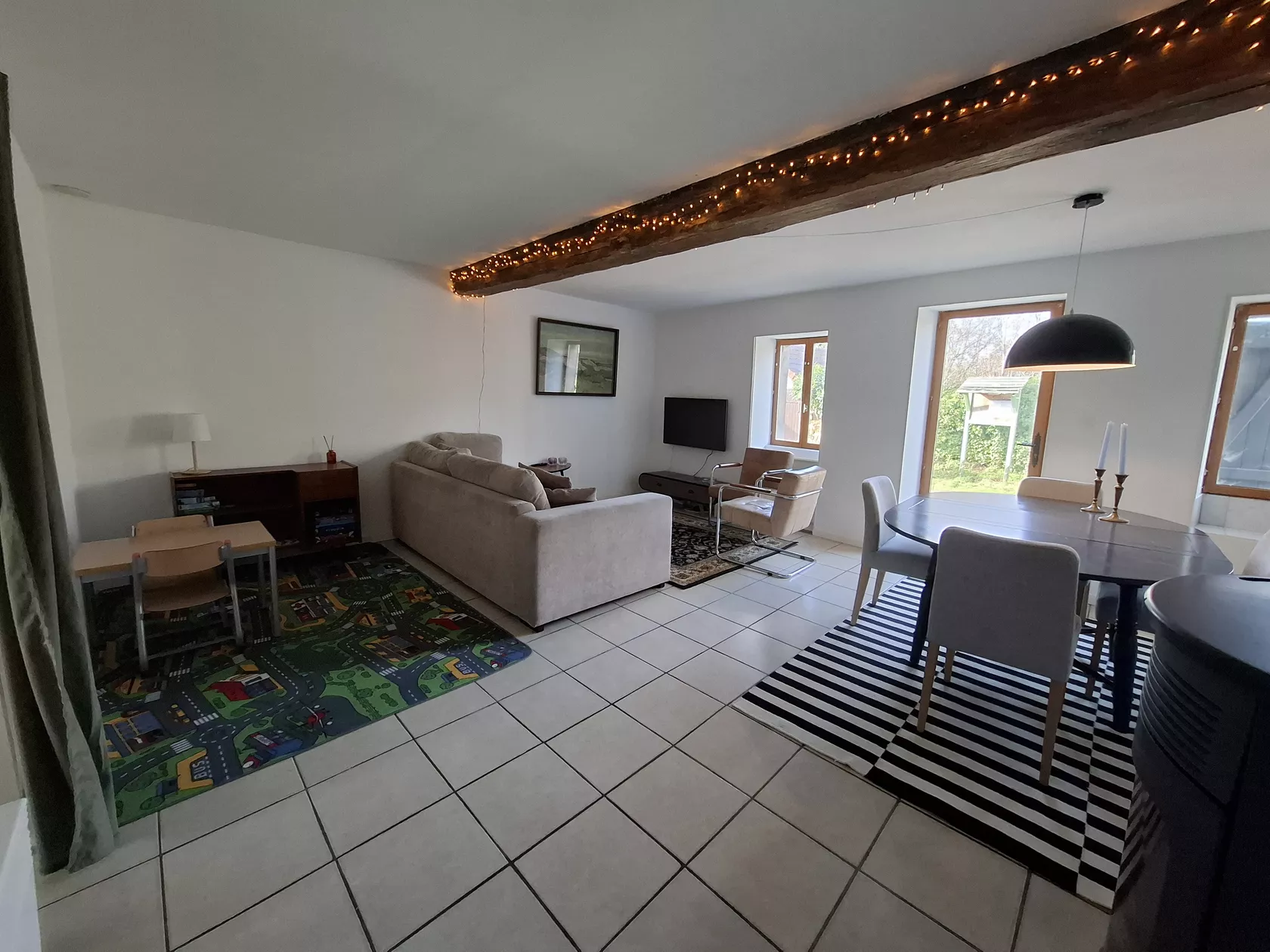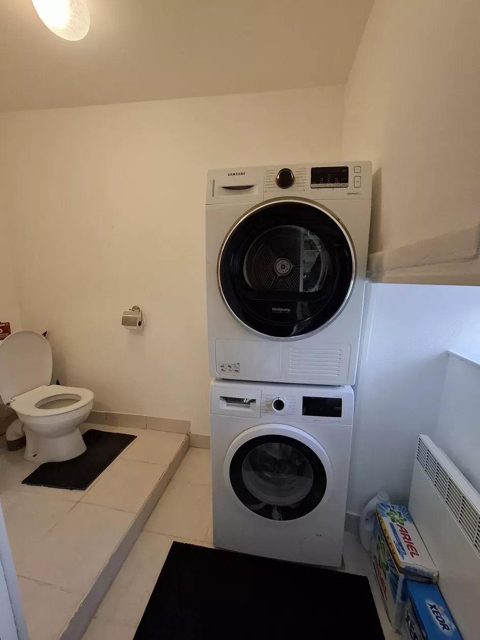 Direct naast de keuken is een wc met wasmachine en droger. Via 2 treden kom je in de iets hoger gelegen woonkamer, daar staat een pellet kachel, een eettafel, zithoek met heerlijke bank, wifi (gratis) en smart TV. Er is een kinderspeelhoek met een tafeltje, speelgoed en diverse spelletjes.