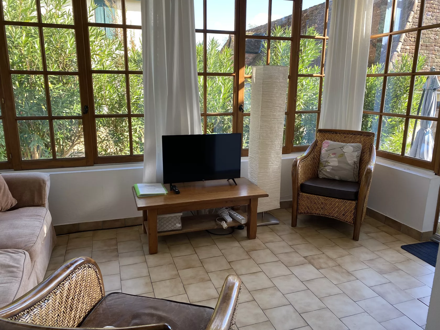 De lichte zitkamer heeft een comfortabele bank en fauteuils, een televisie, een selectie boeken en gratis WIFI.