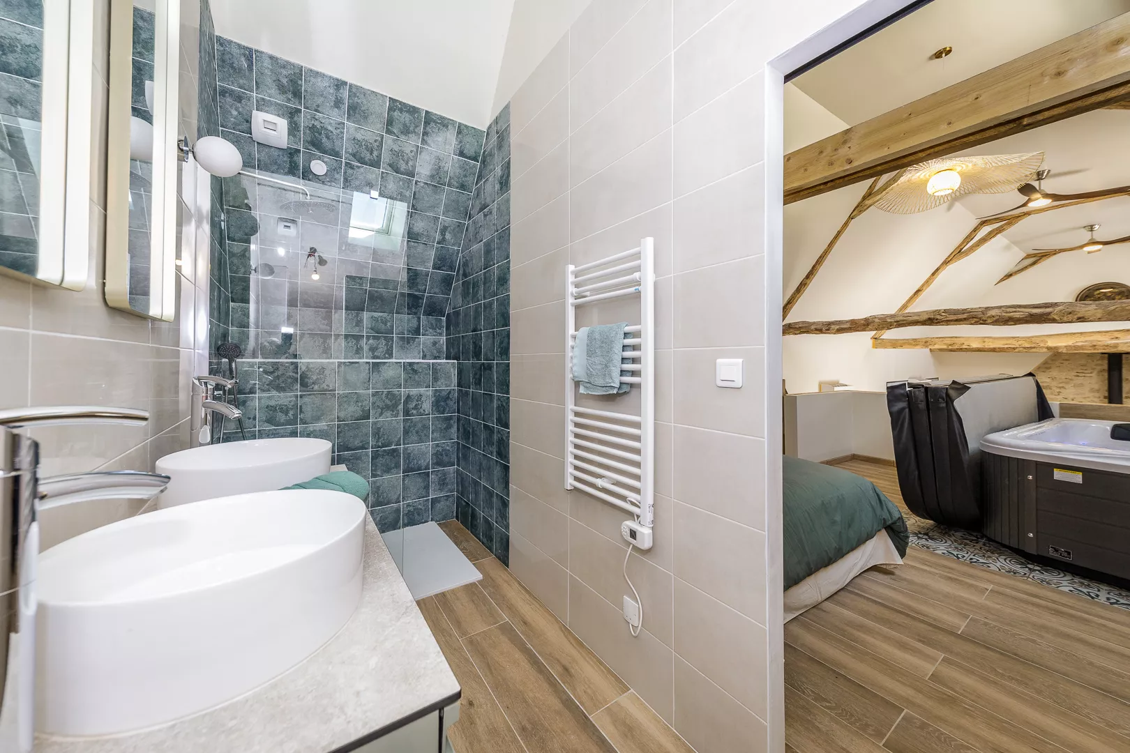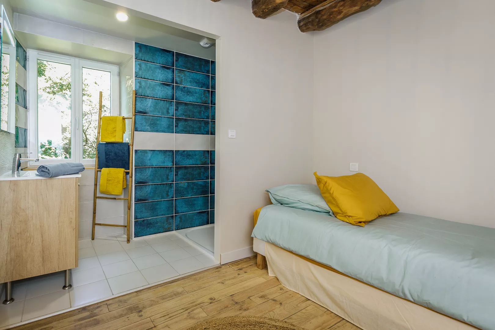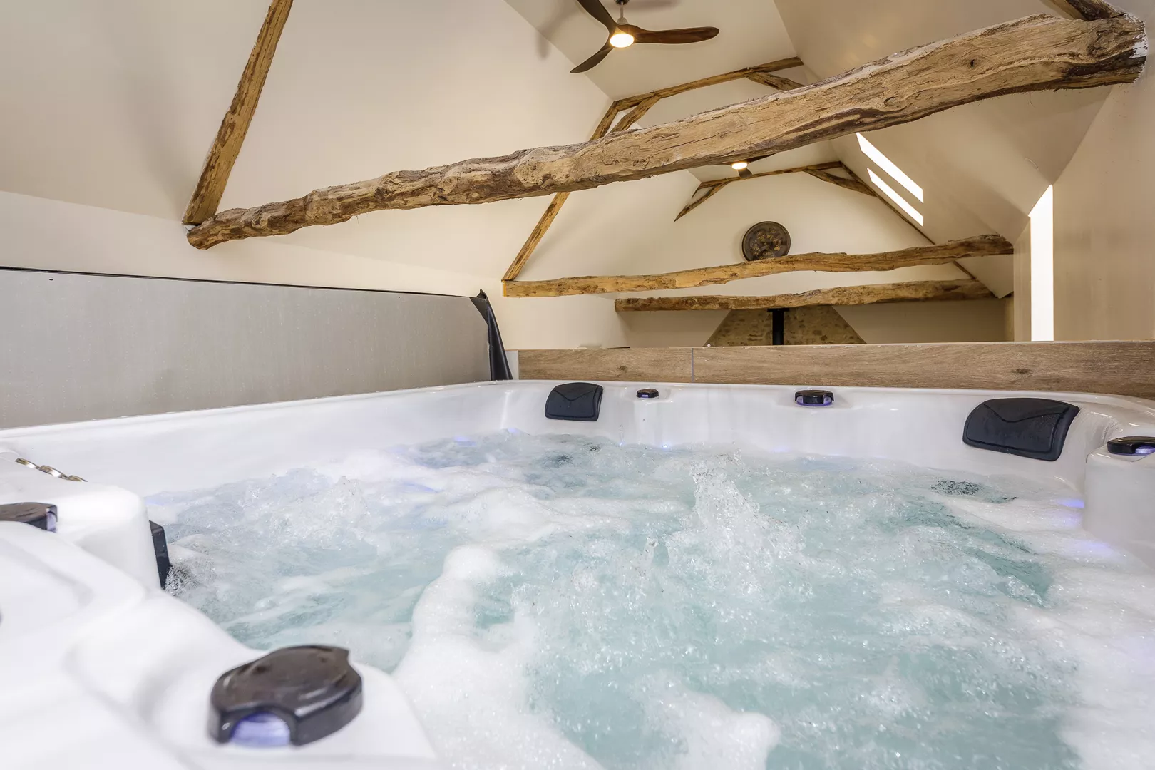 Sourcette heeft vier comfortabele slaapkamers, elk met een eigen badkamer om uw privacy te garanderen. Eén van de slaapkamers ligt verscholen boven de woonkamer en heeft haar eigen jacuzzi (6 personen). Beneden ligt de grote woonkamer, waar u in een goed uitgeruste keuken smakelijke maaltijden kunt bereiden voor uw familie of vrienden op het centrale kookeiland.