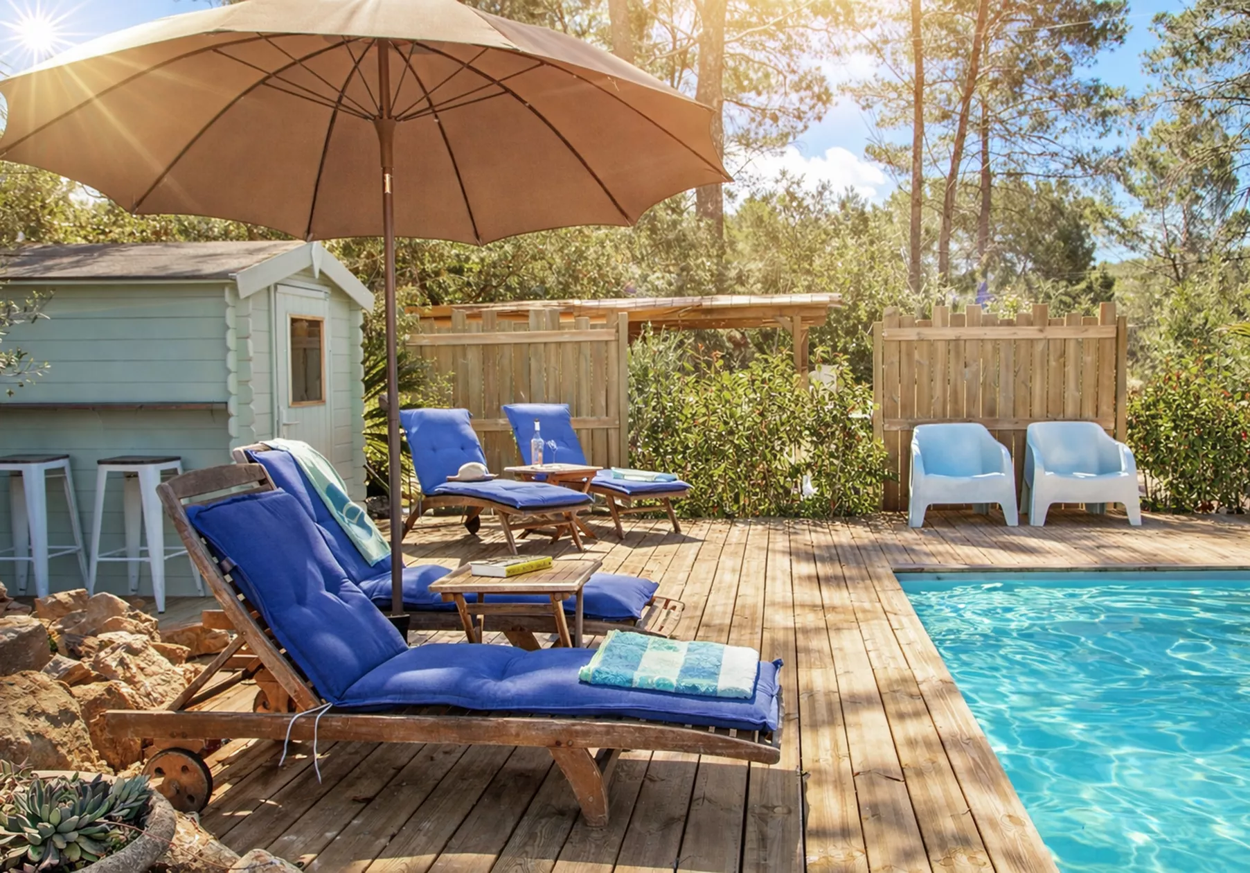 Het zwembadgedeelte is aanzienlijk met ligstoelen, parasols, tafels en stoelen. Het zwembad is klein (4,5M x 2,5M x 1,5M) maar biedt voldoende mogelijkheden om af te koelen, te loungen en te zwemmen, en is volledig privé..
