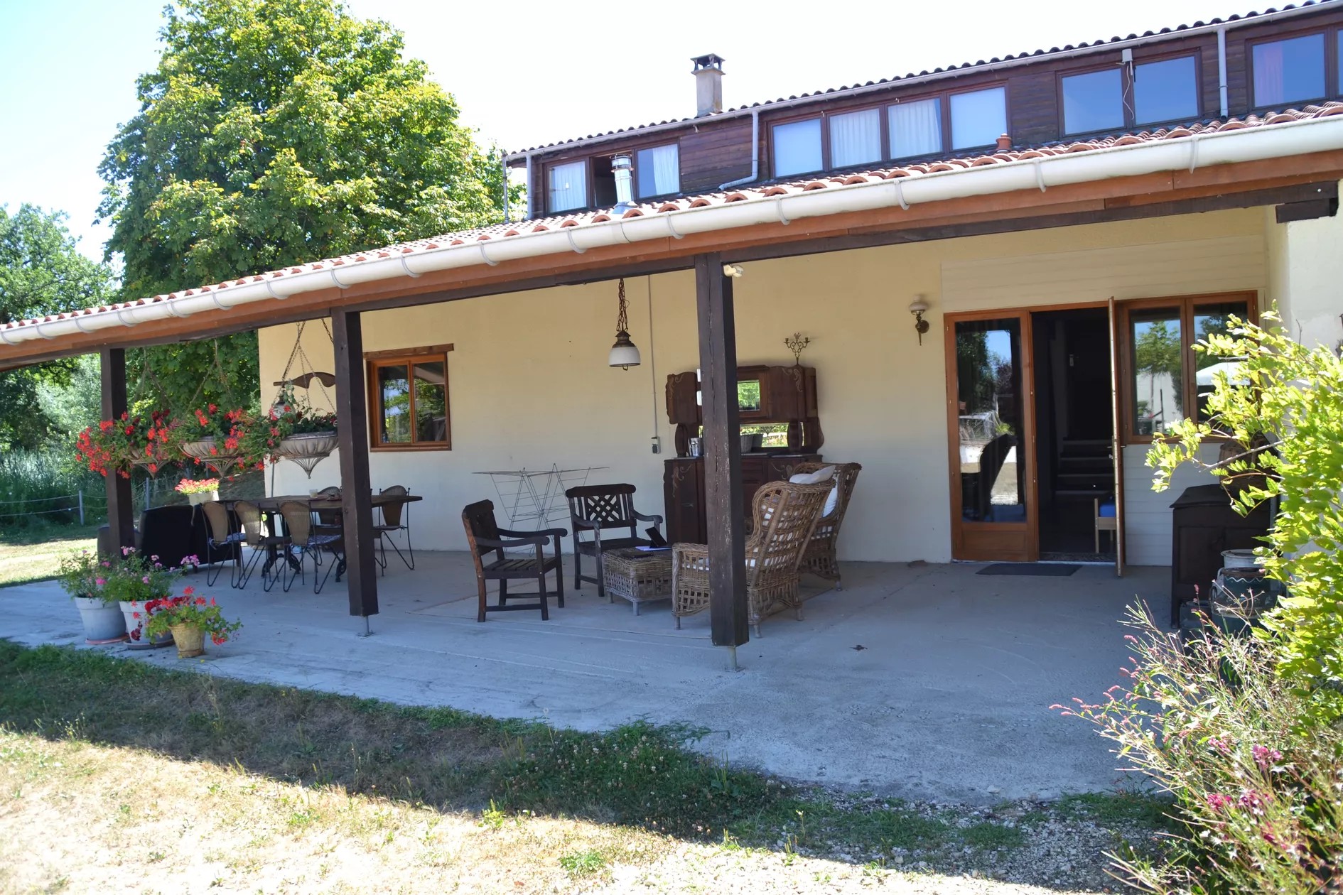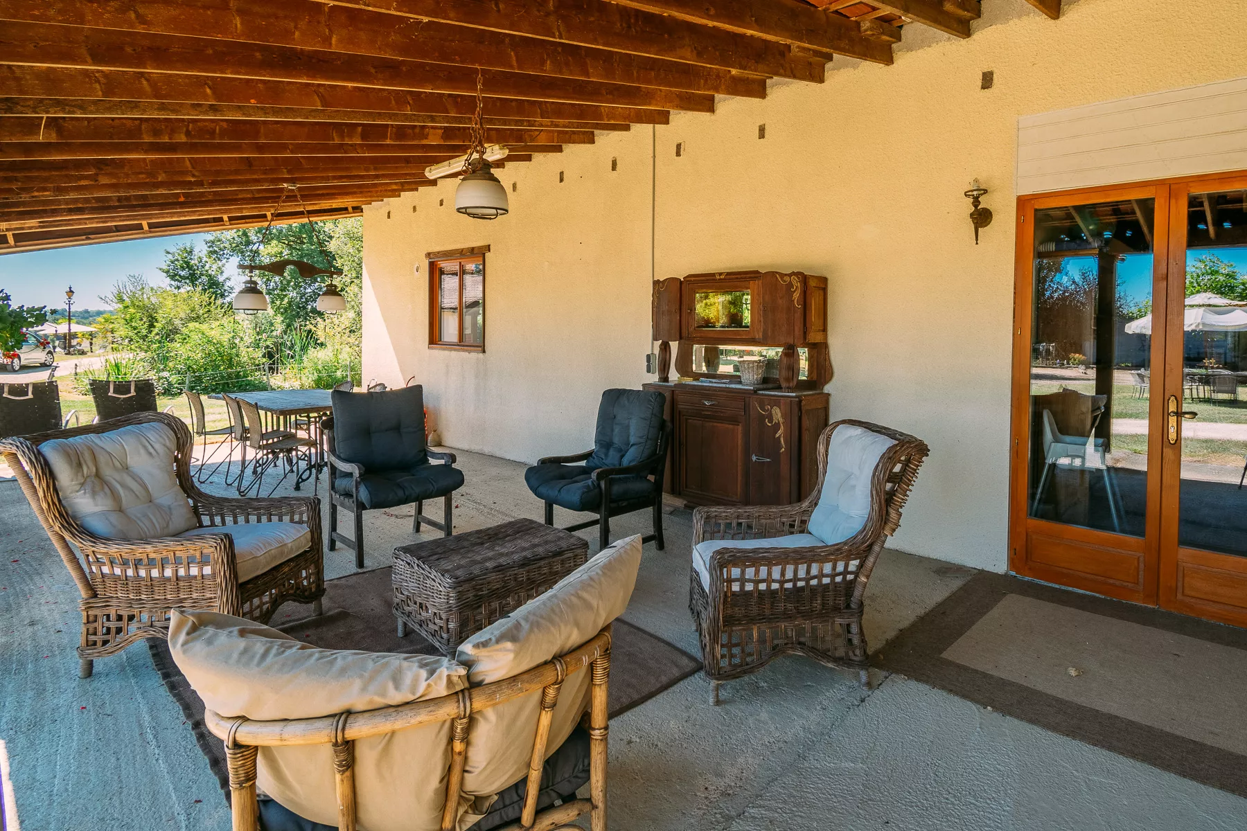 Het enorme overkapte terras is voorzien van een houten eettafel en een huiselijke zithoek, echt een heerlijk familie-plekje. Vanaf het terras geniet u van een mooi uitzicht over de vijver en het landschap. Een heerlijke plek om met een kopje koffie de dag te beginnen.