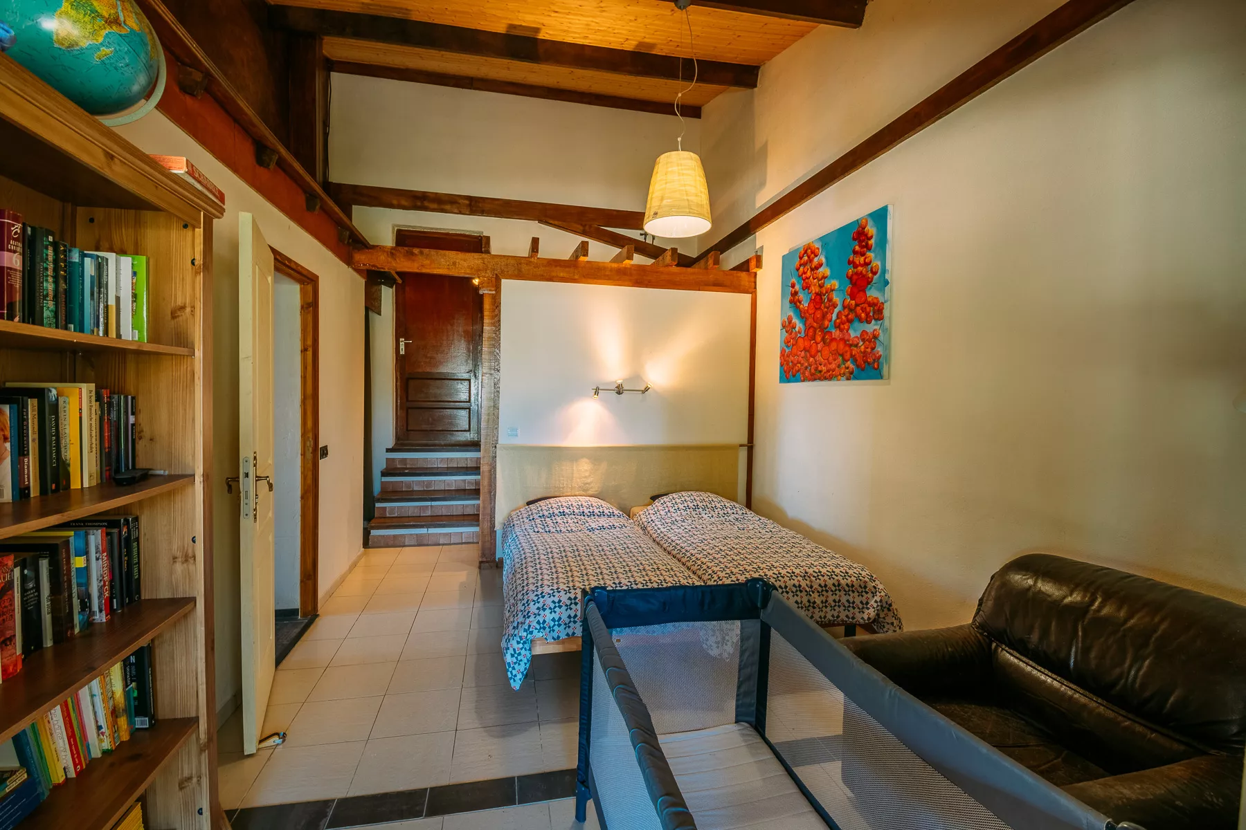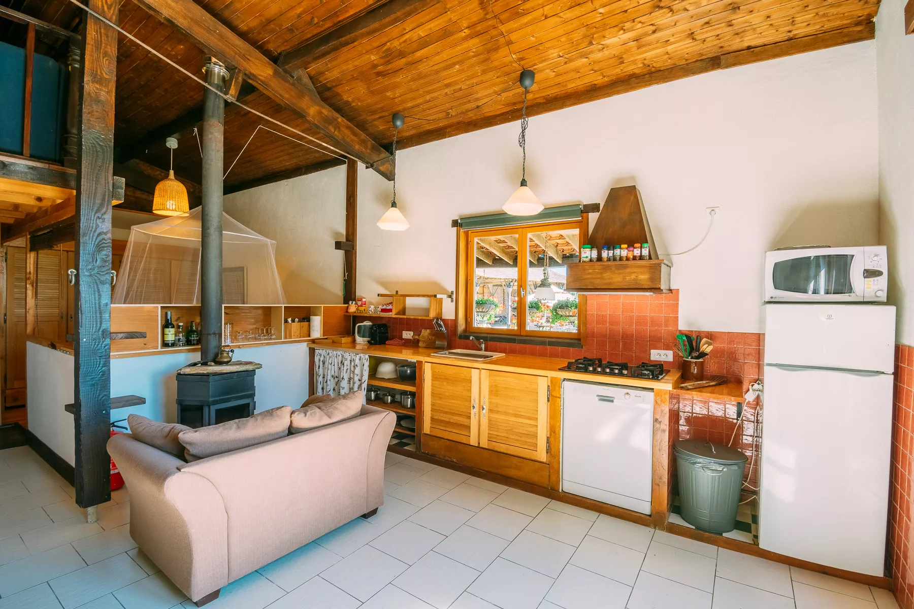 De open keuken is zeer compleet uitgerust met oa nespresso koffieapparaat, een oven en een vaatwasser. Op de entresol is een gezellige lounge-hoek met slaapbank en tv. Huis Madeleine heeft twee slaapkamers, de ouderslaapkamer met 1.60x200 bed en een kinderkamer met twee 0.90x200 bedden. Er zijn twee badkamers met douche en wastafel en er is een separate toilet.
