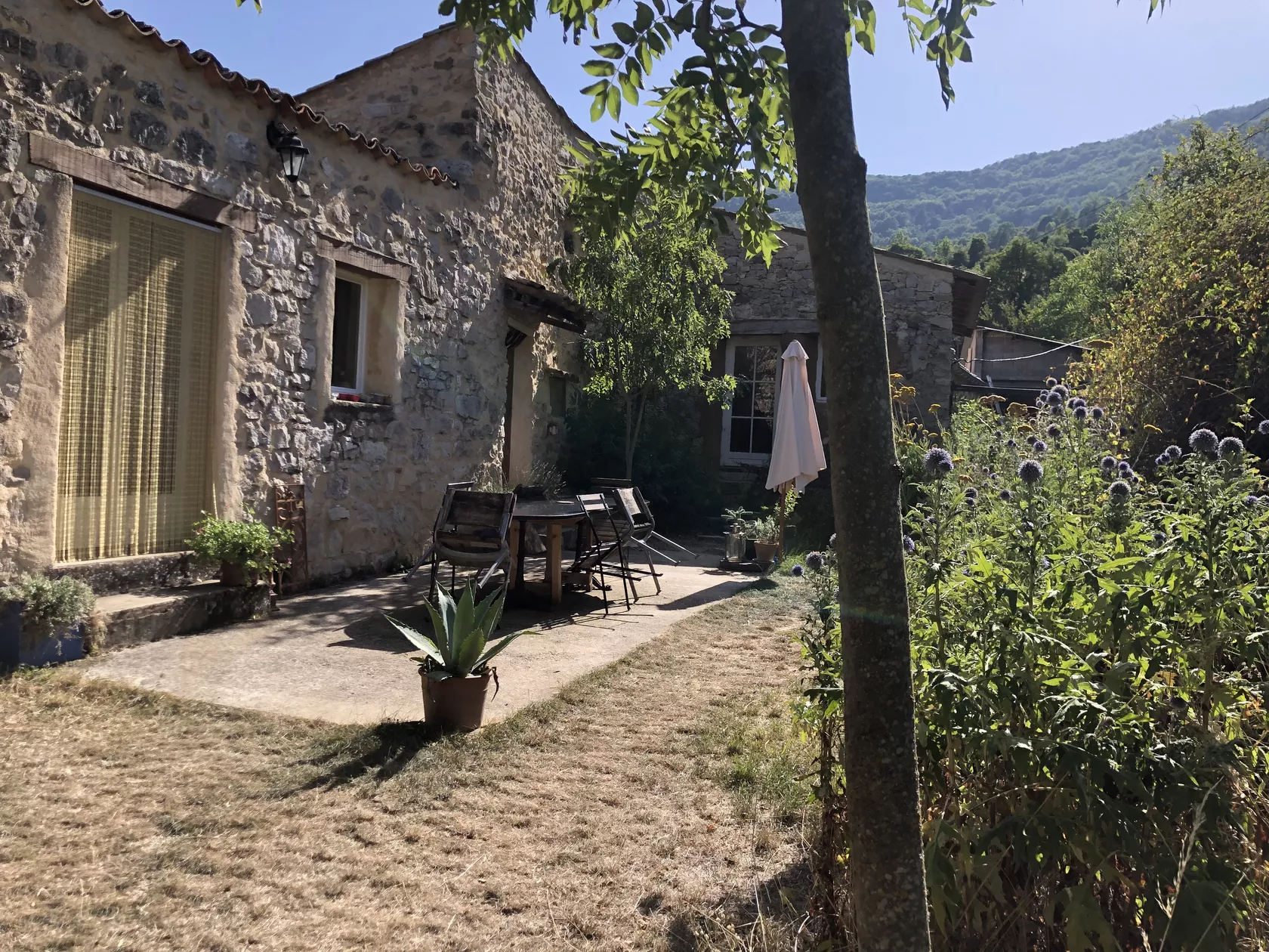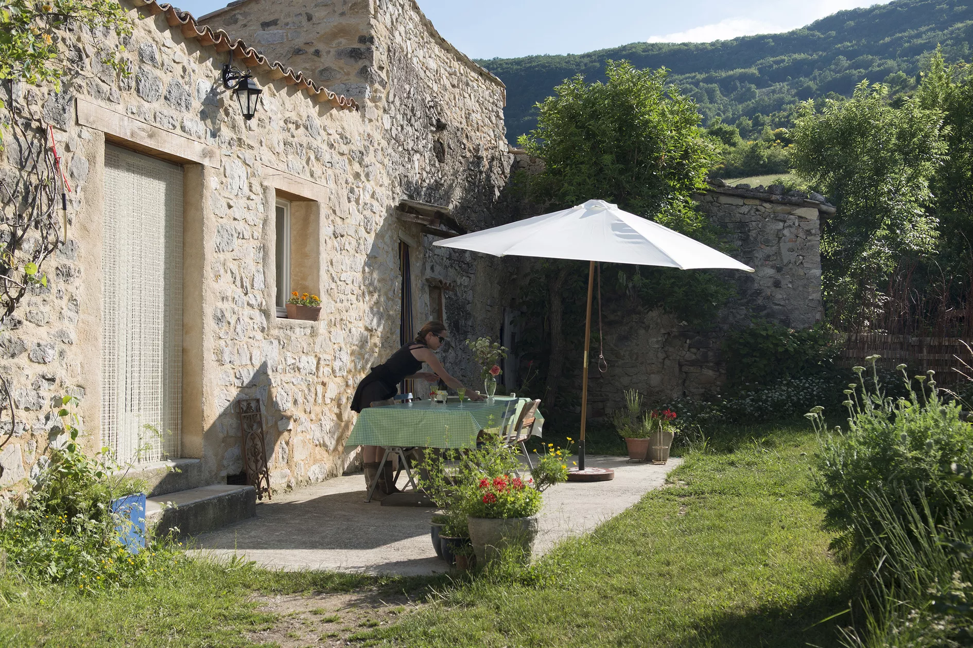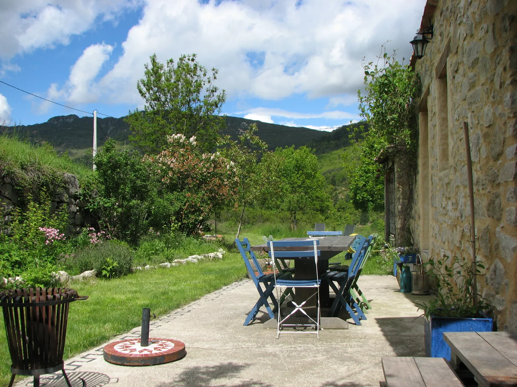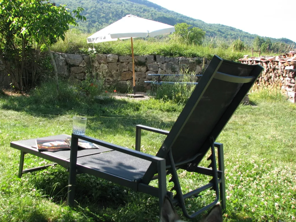 De openslaande deuren van de eetkamer komen uit op het terras en de tuin aan de achterkant van het huis. Er zijn verschillende plekken om buiten te zitten, op het terras bij het huis, onder de lindeboom in de schaduw of in het gras. Op alle plaatsen heeft u een weids uitzicht over de vallei en op de bergen.