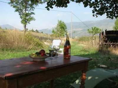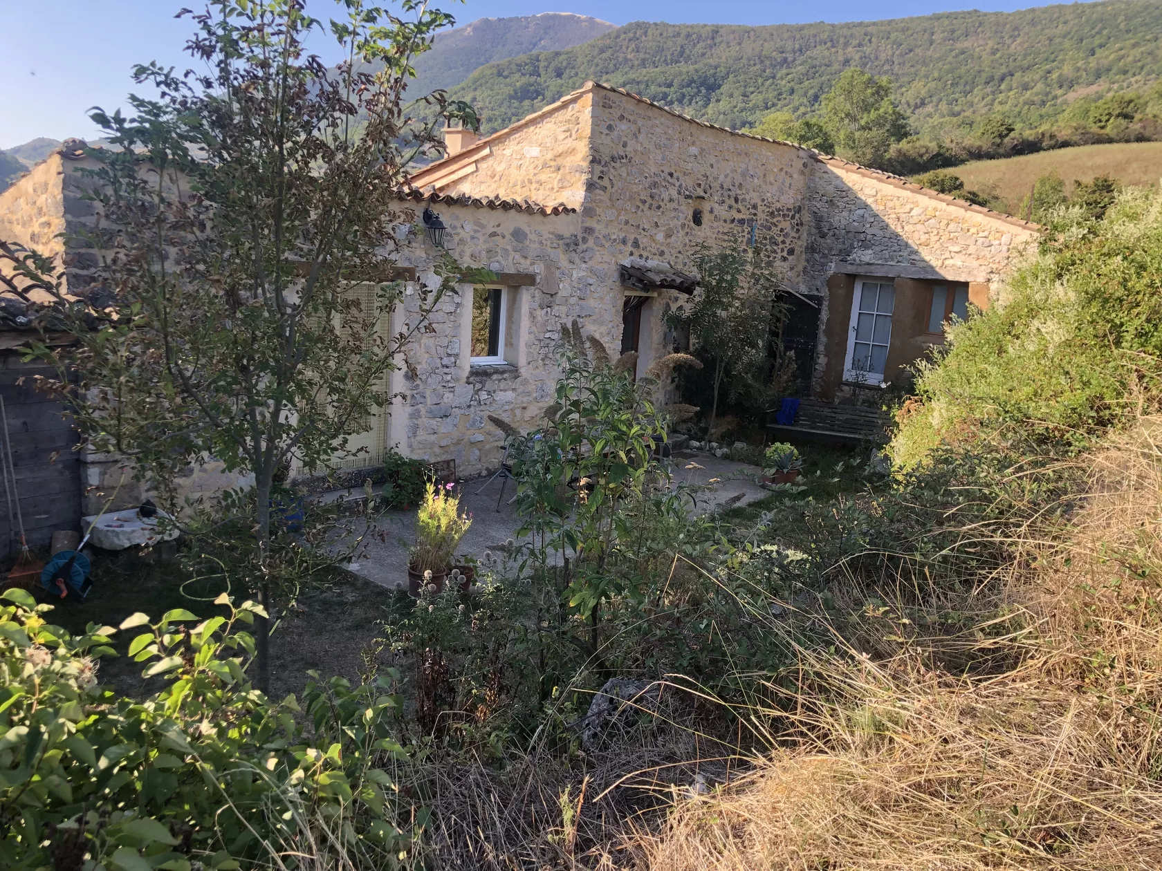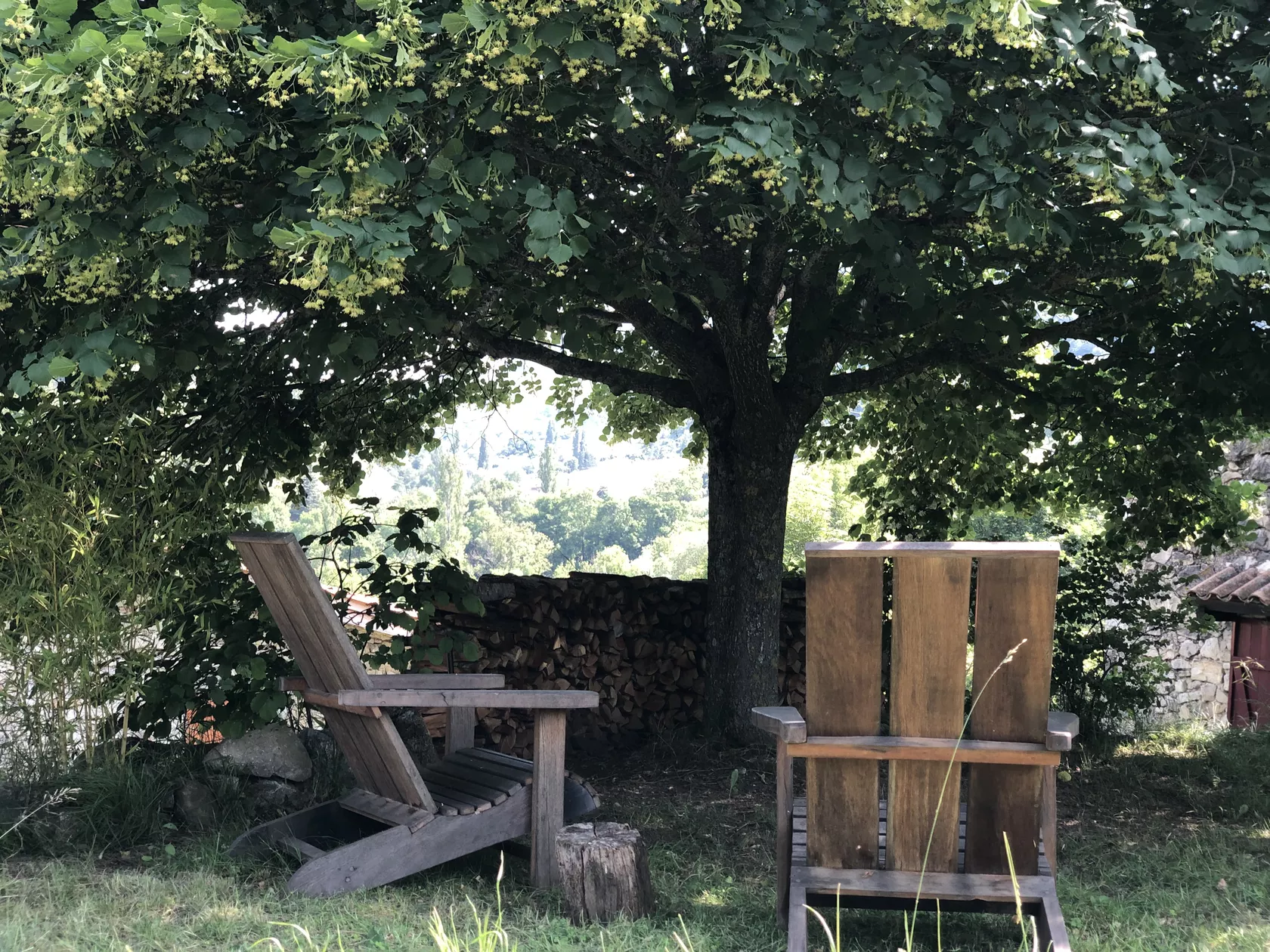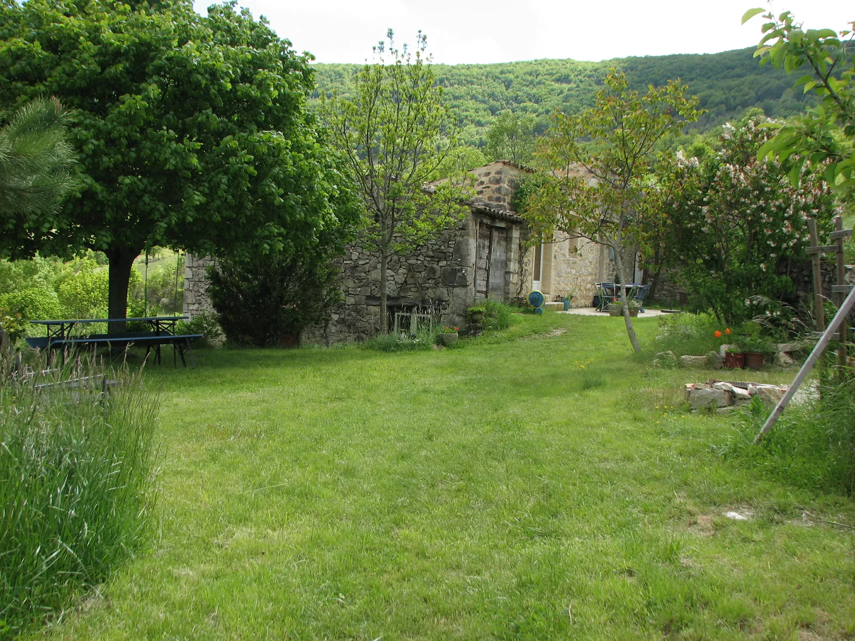De openslaande deuren van de eetkamer komen uit op het terras en de tuin aan de achterkant van het huis. Er zijn verschillende plekken om buiten te zitten, op het terras bij het huis, onder de lindeboom in de schaduw of in het gras. Op alle plaatsen heeft u een weids uitzicht over de vallei en op de bergen.